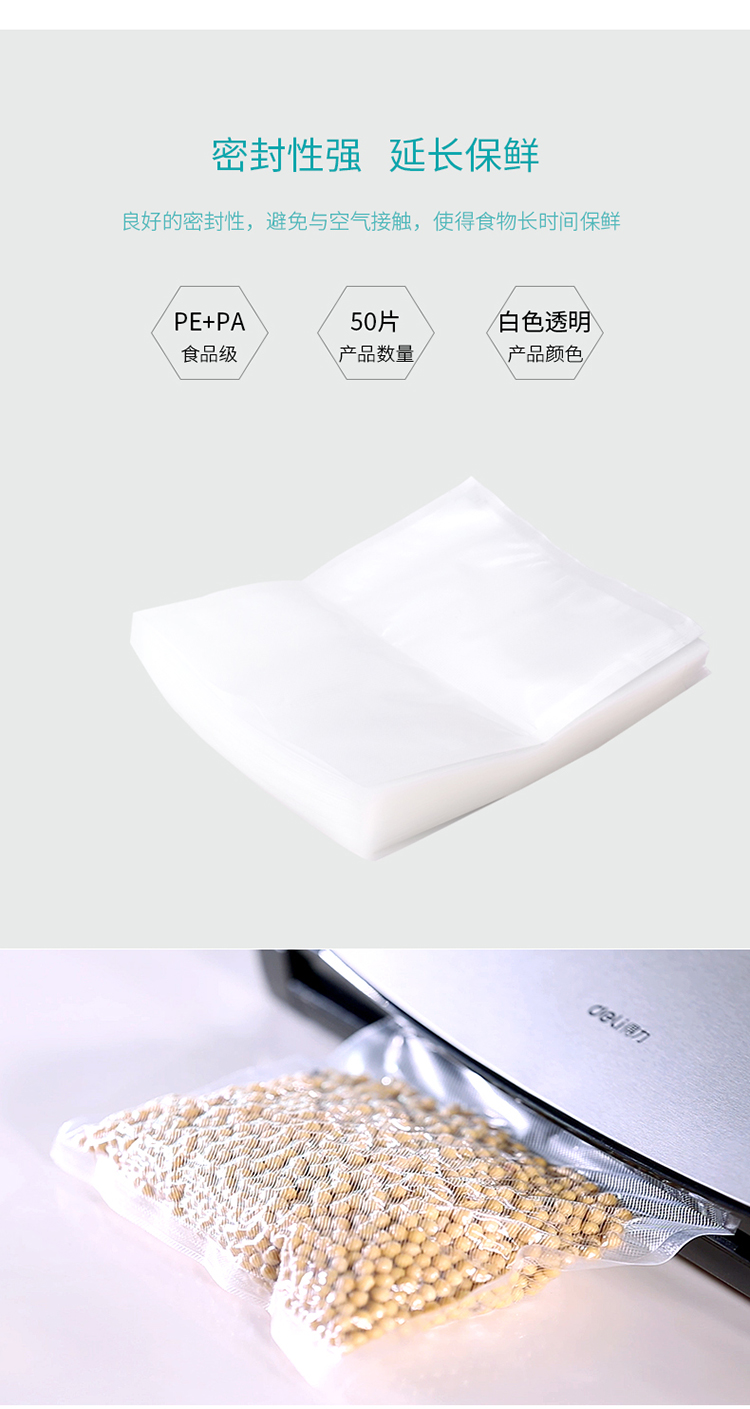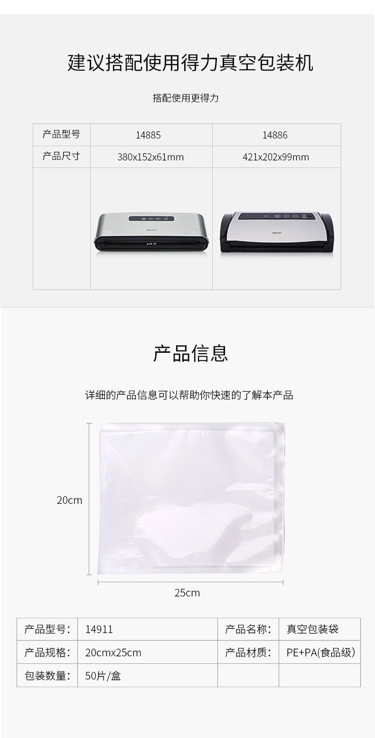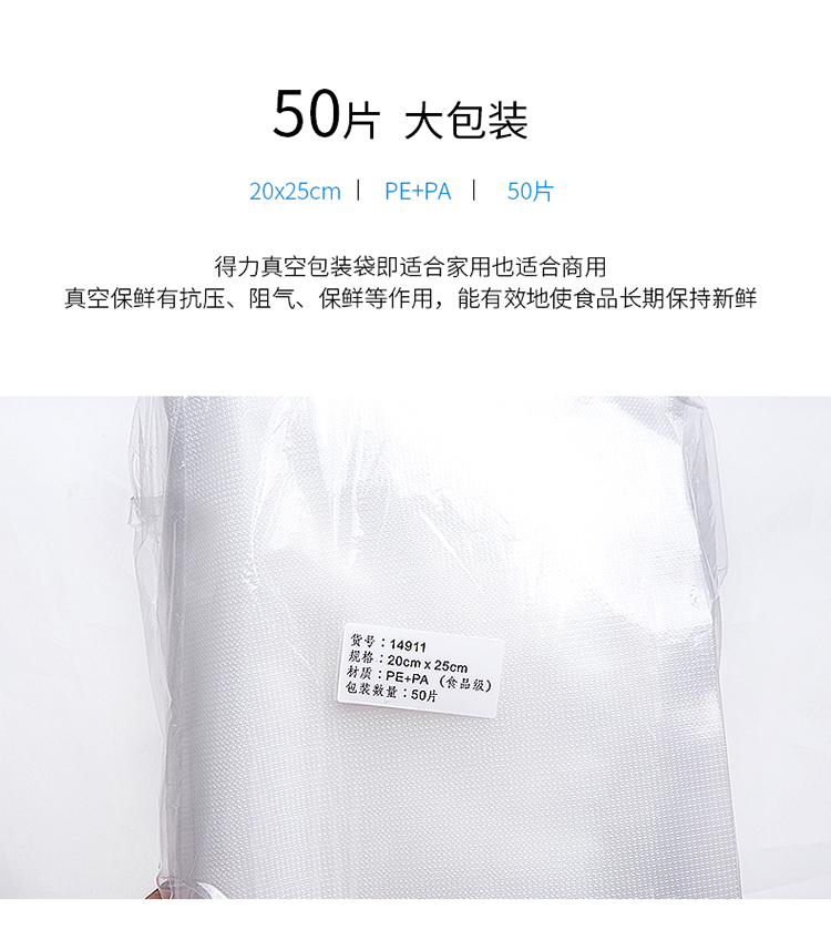 商品名称:得力(deli)14911 真空机包装袋 食物真空保鲜袋 包装袋20*25CM(本色)(50片/盒)