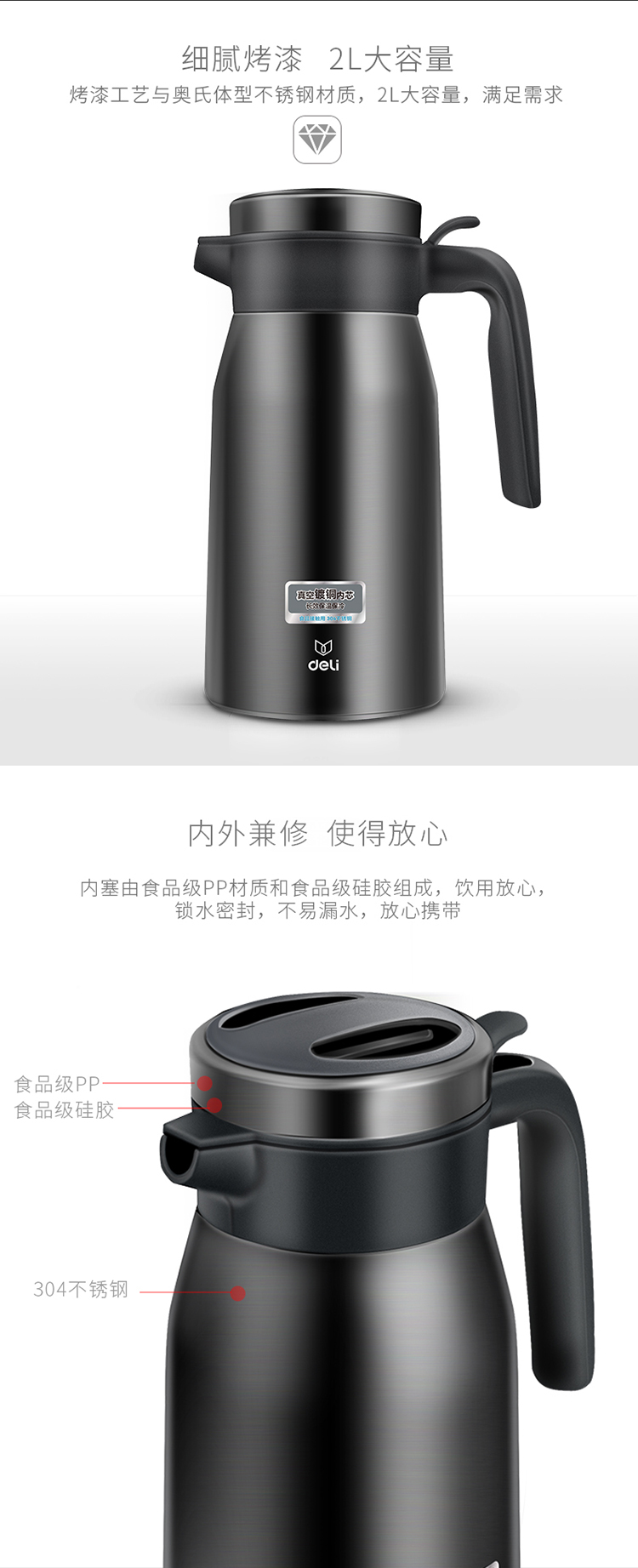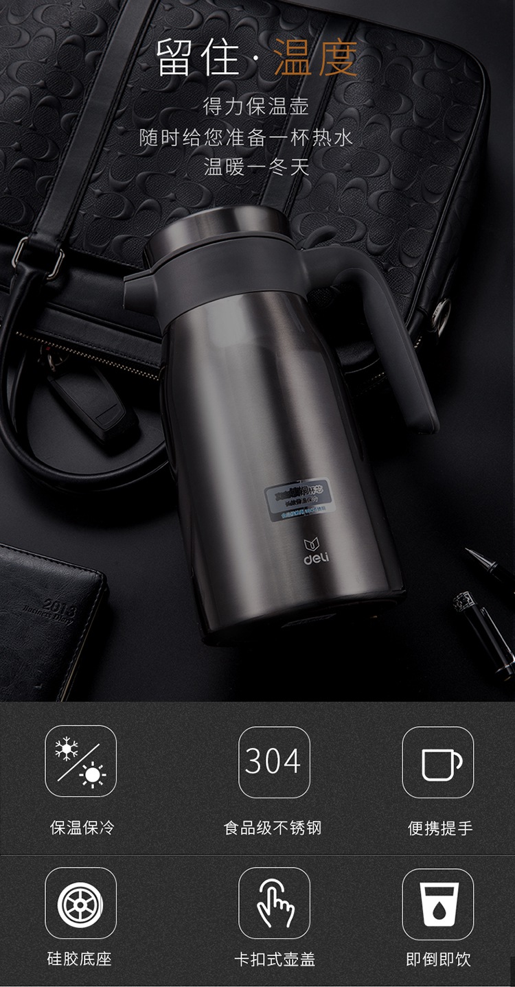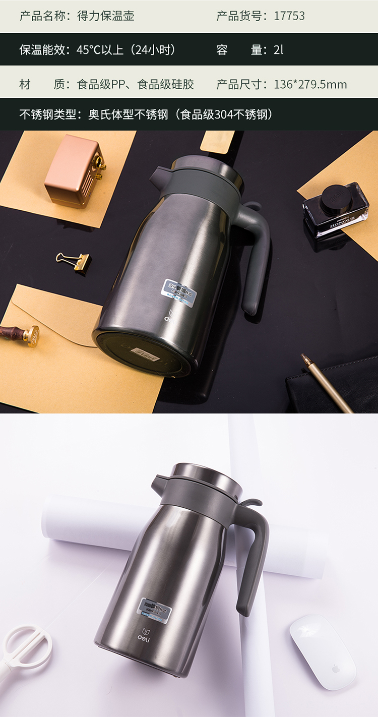 商品名称:得力(deli)17753 2L真空不锈钢保温保冷壶 大容量暖水瓶 深灰