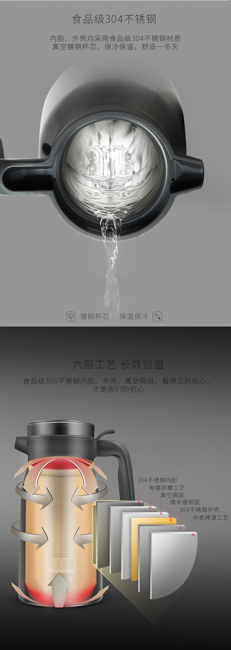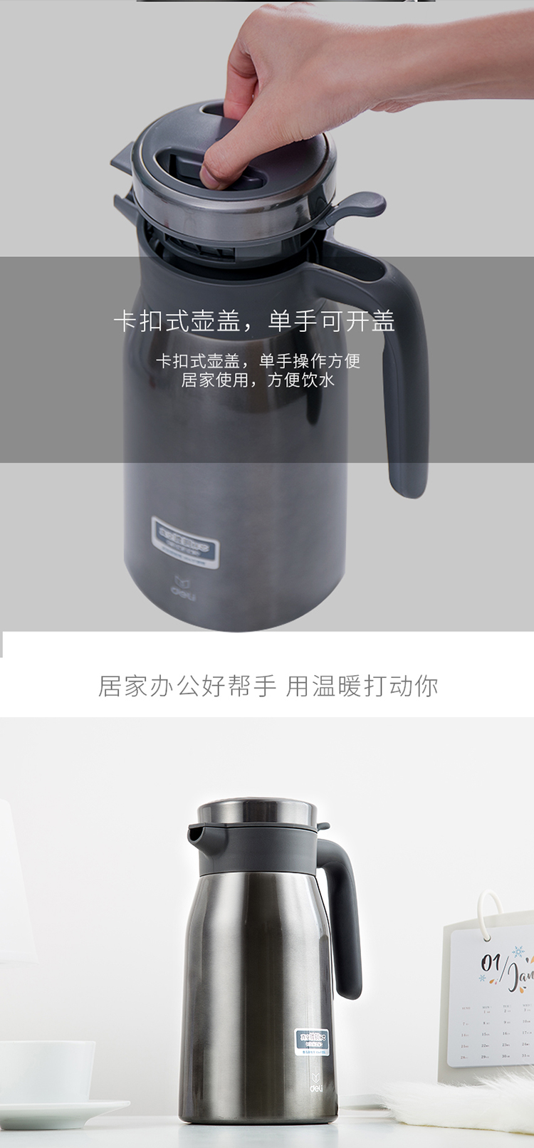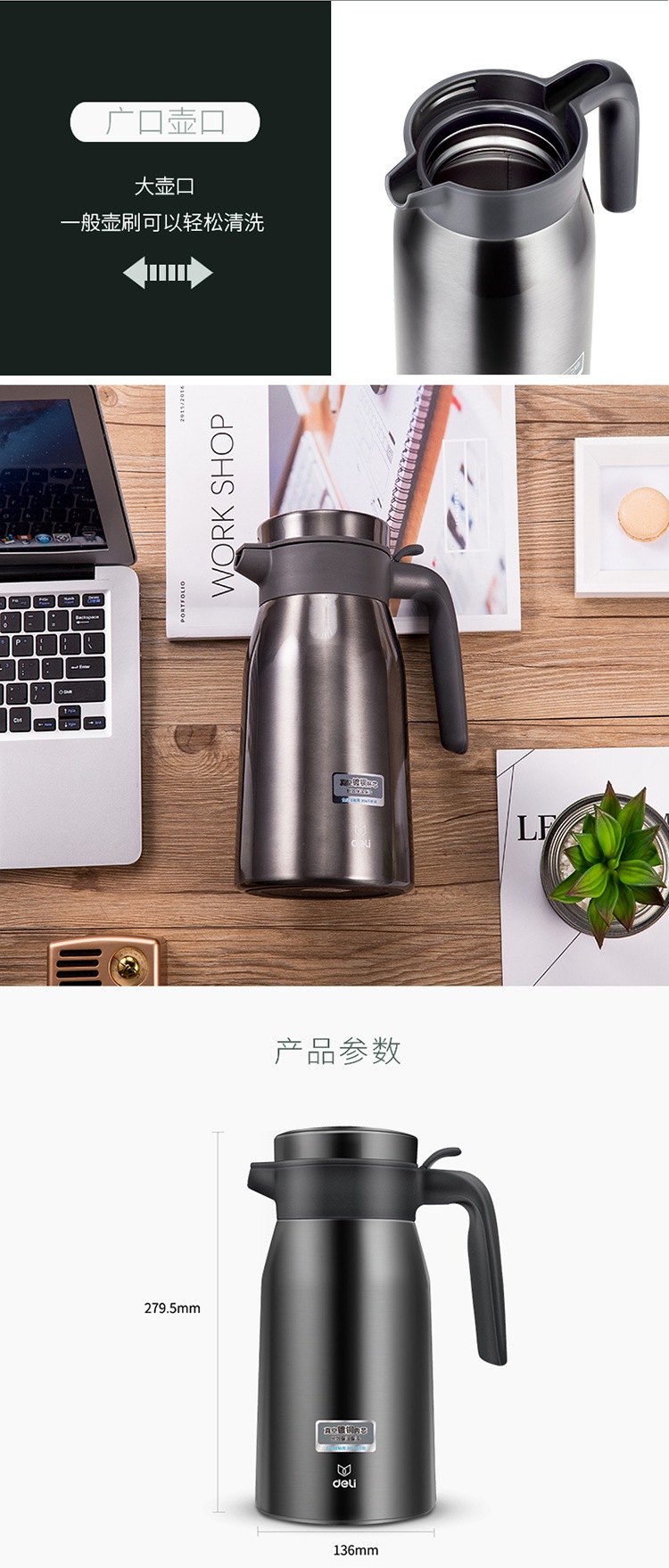 商品名称:得力(deli)17753 2L真空不锈钢保温保冷壶 大容量暖水瓶 深灰