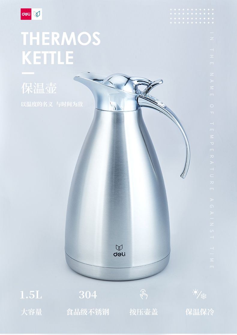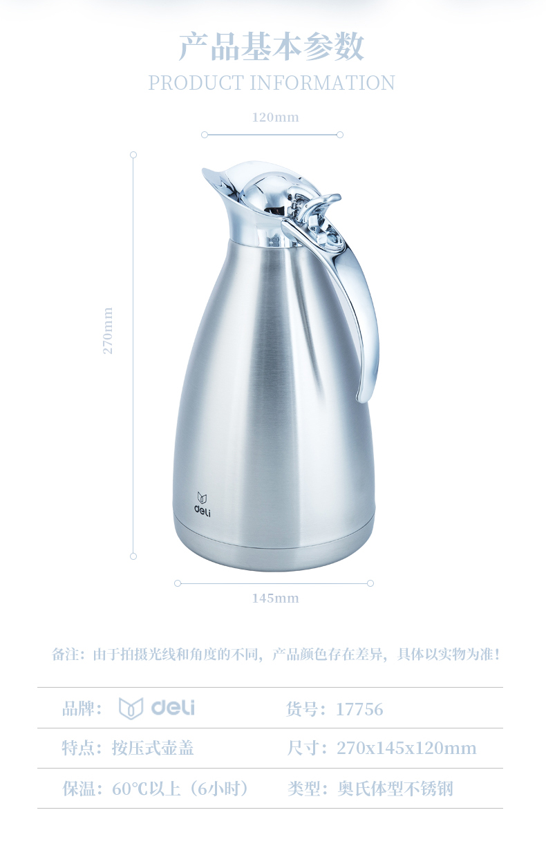 商品名称:得力(deli) 家用不锈钢保温壶 大容量 热水瓶保温水壶 暖壶 保温瓶 17756