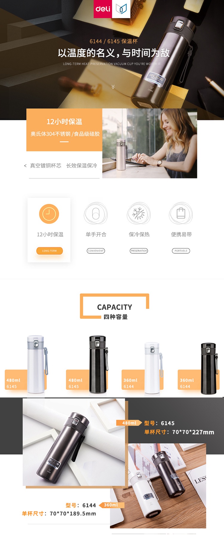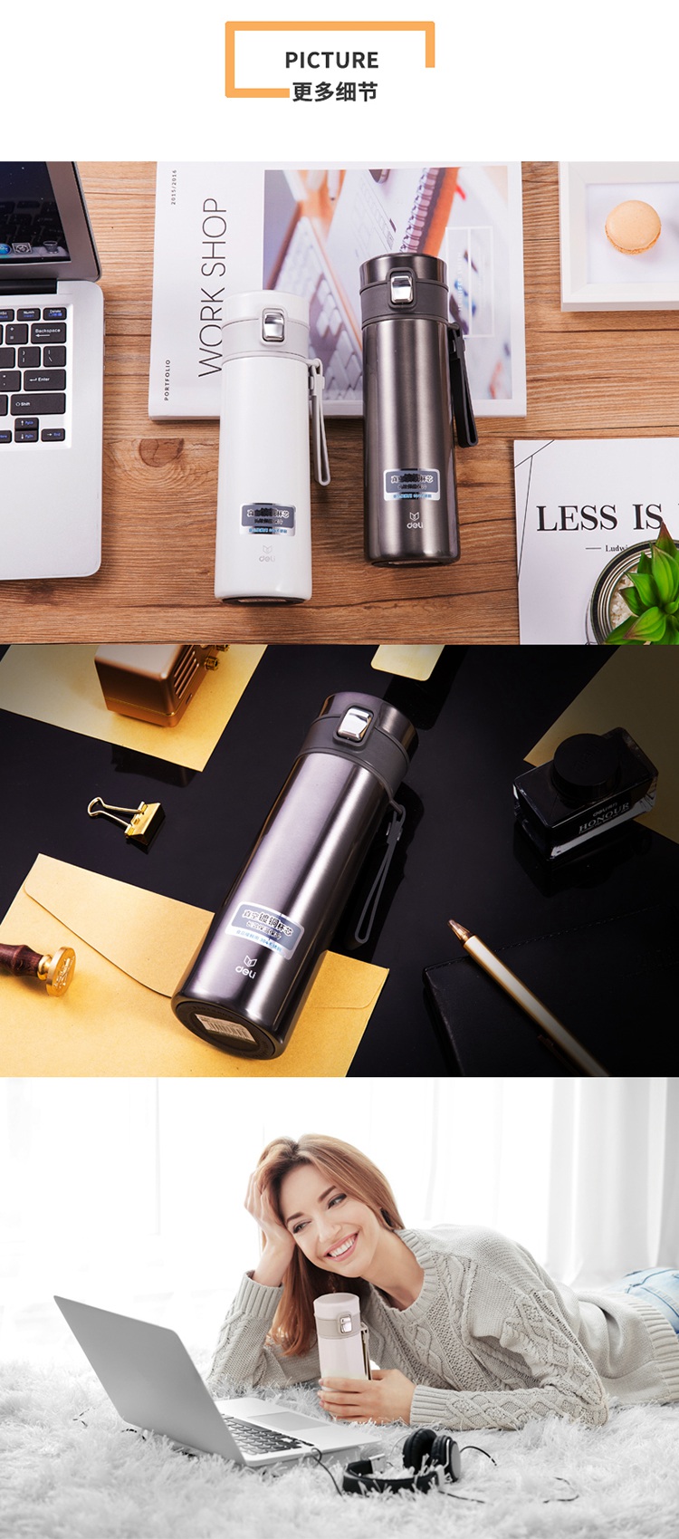商品名称:得力(deli)6145 真空不锈钢保温杯 按扣弹盖式带提绳杯子 深灰色 480ml