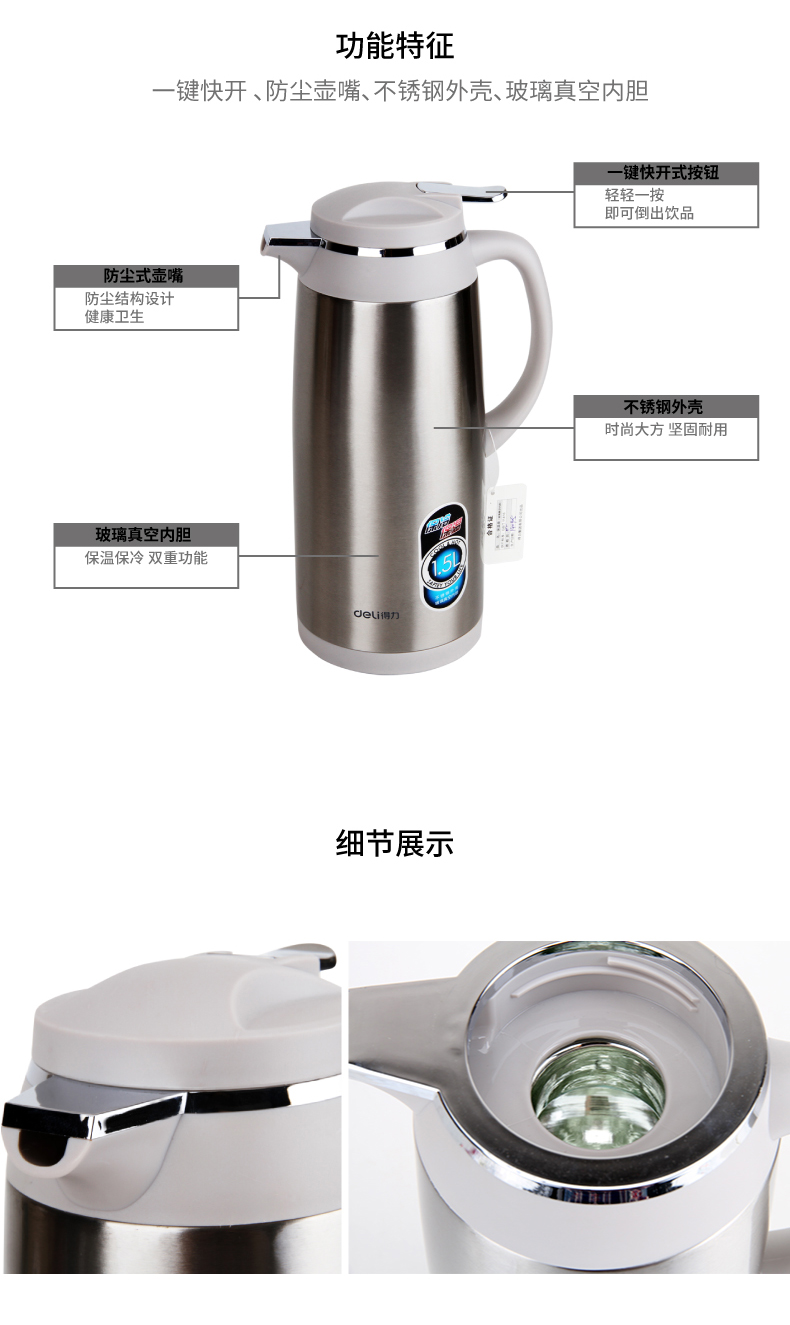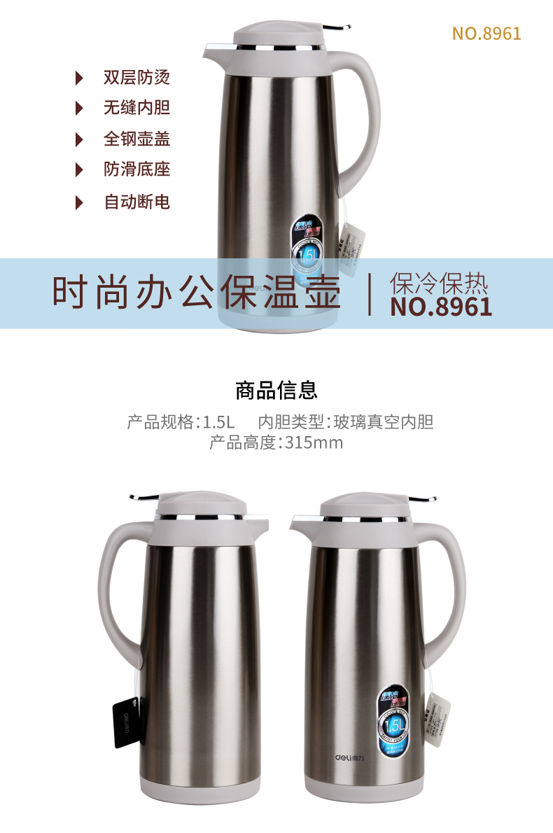 商品名称:得力(deli)8961 不锈钢外壳玻璃真空内胆保温壶 办公/会议/家用保温壶 1.5L本色