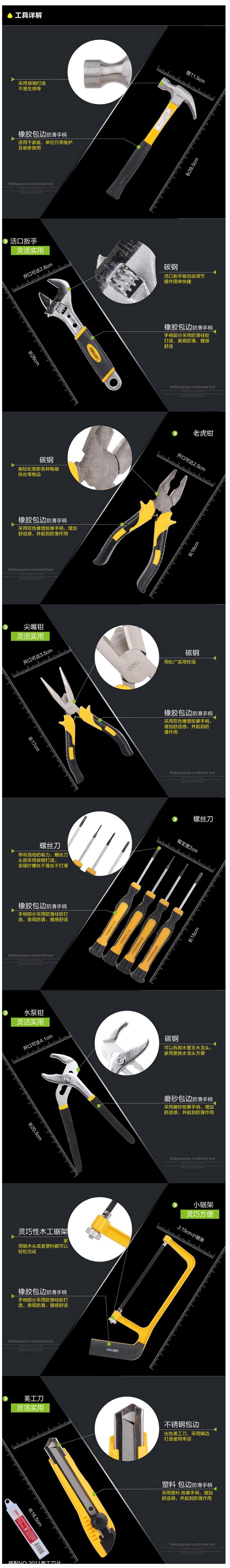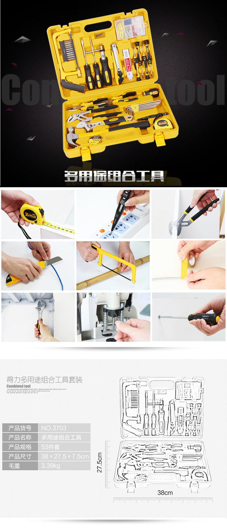 商品名称:得力(deli)3703 多功能组合工具箱 家用/维修/五金工具套装 53件套