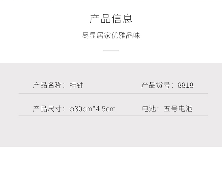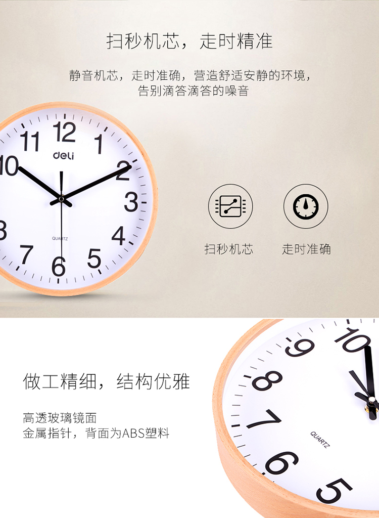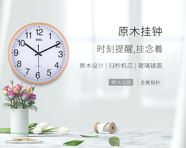 商品名称:得力(deli) 8818 时尚原木静音挂钟 客厅圆形榉木时钟 直径30cm 木纹色