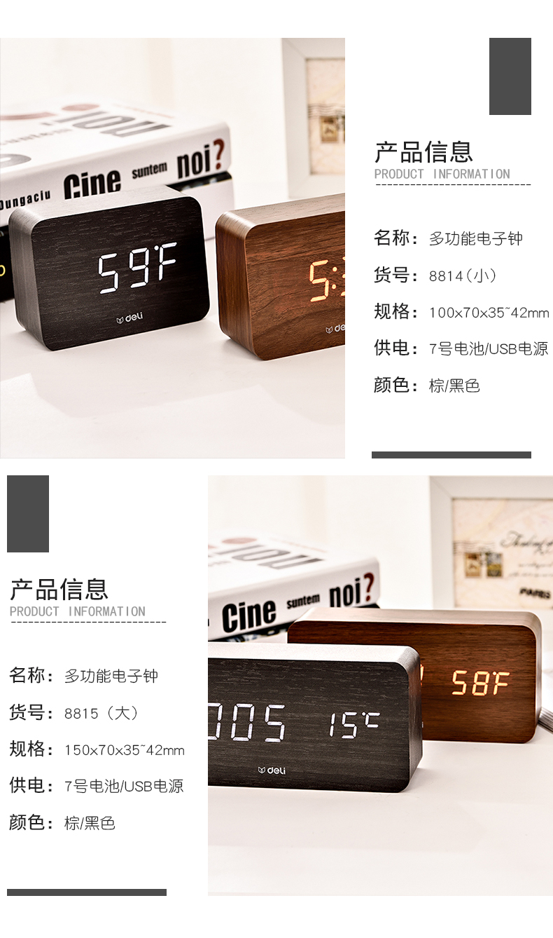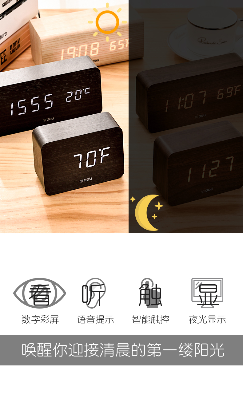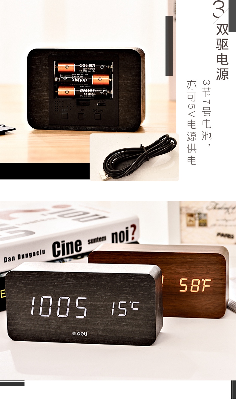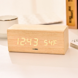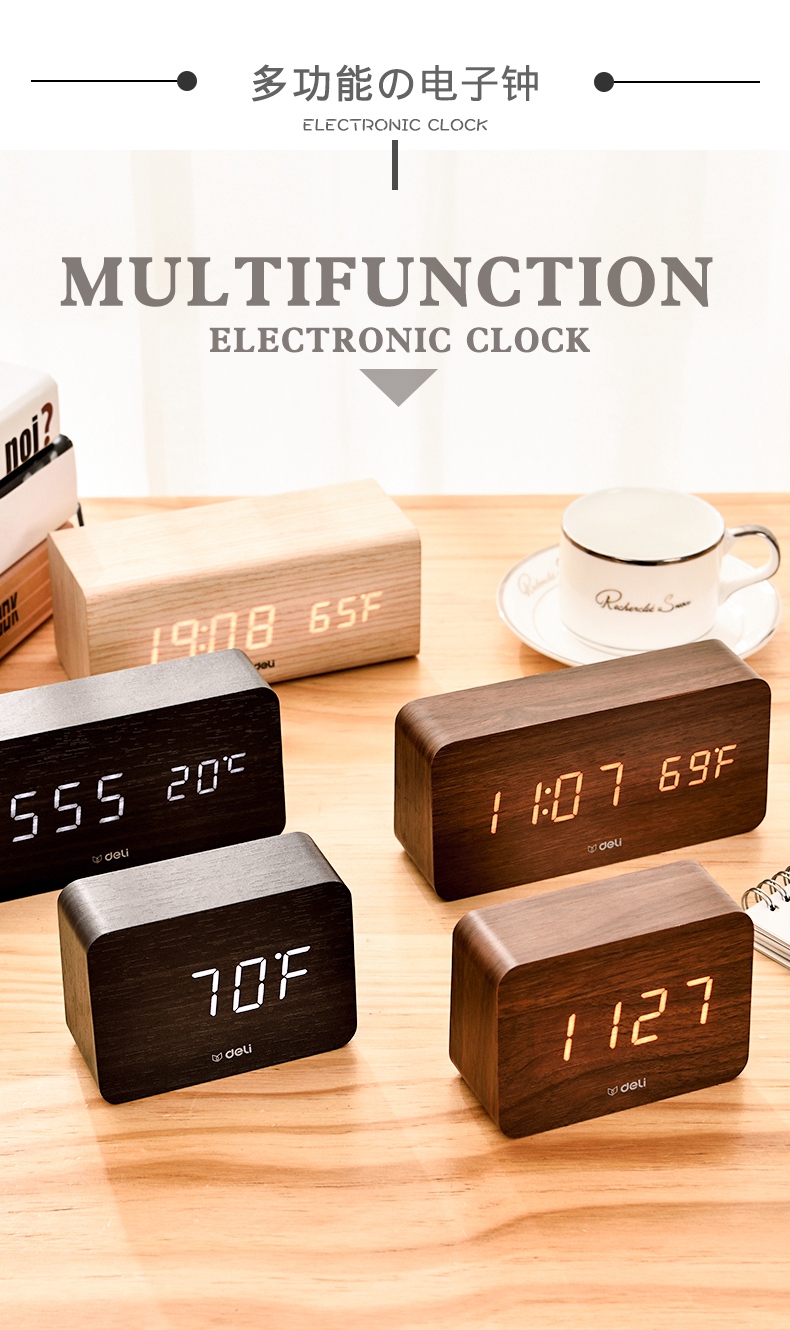 得力 8820 学生显示夜光声控电子钟 简约室内温度计床头时钟 木纹(大号)