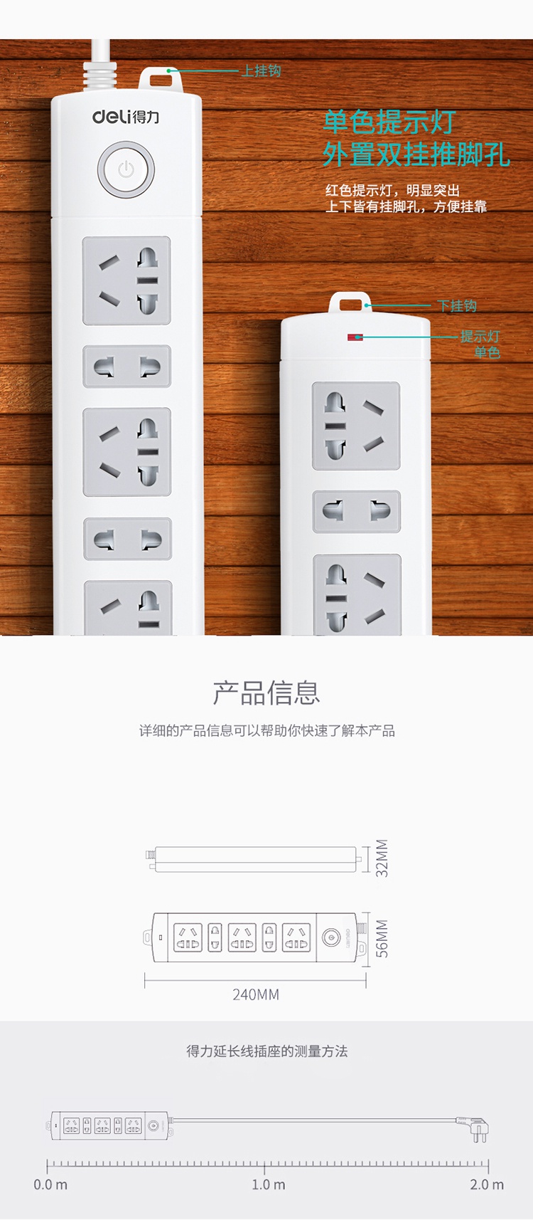 商品名称:得力(deli)18202 新国标5位2米 总控开关插座