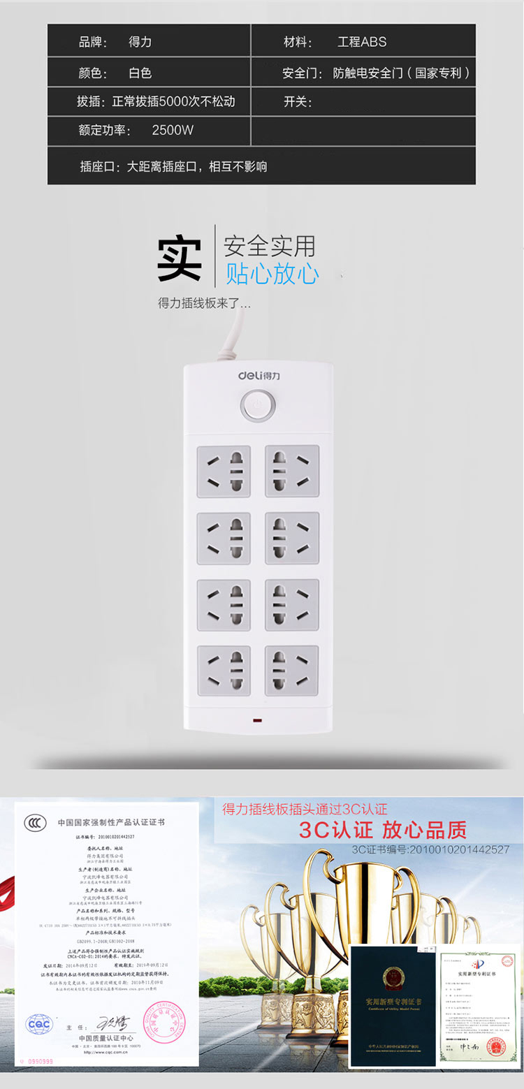 商品名称:得力(deli) 线板插排 3m插座 拖线板开关电源 18213