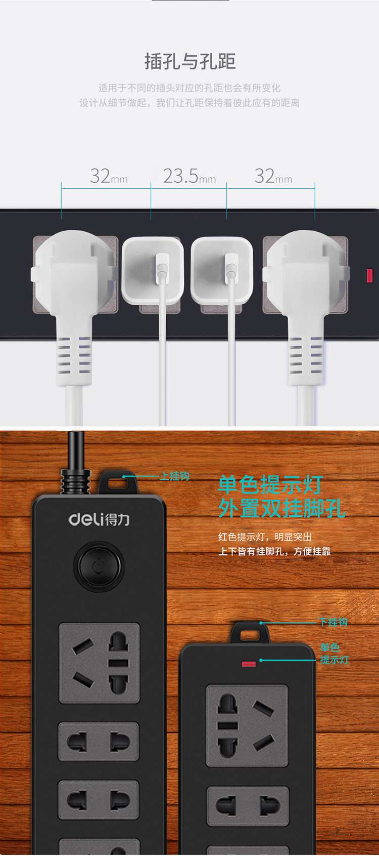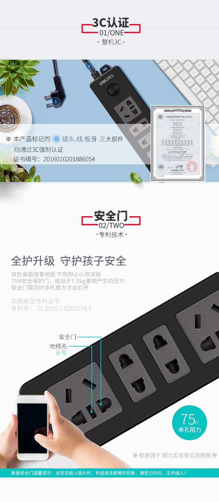 得力 (deli) 新国标 防触电 总控开关 延长线插座