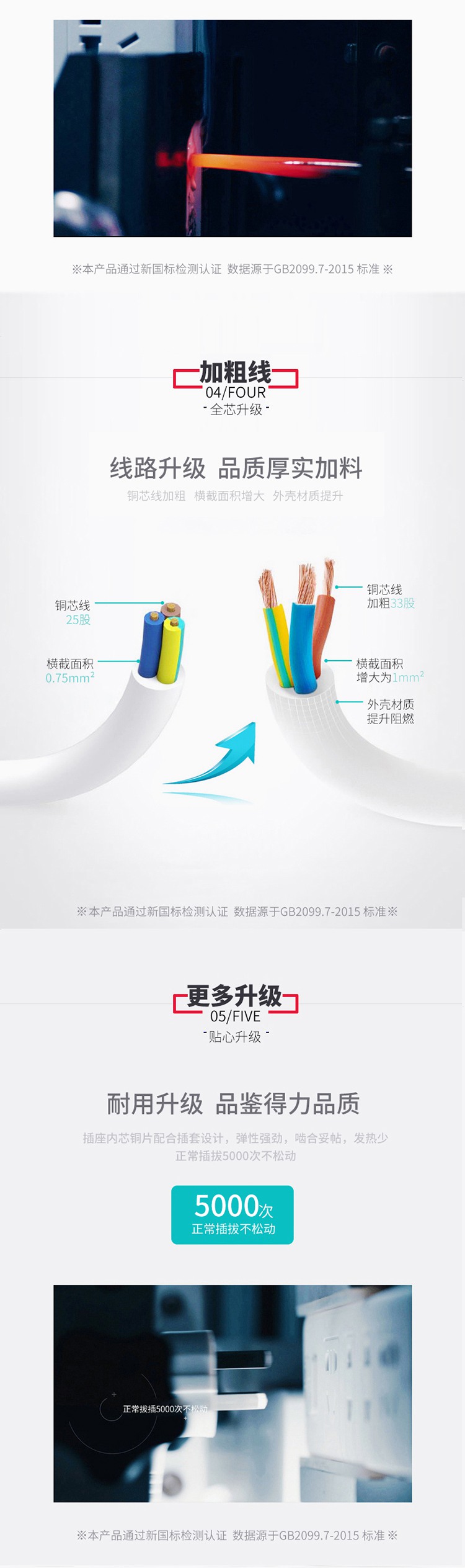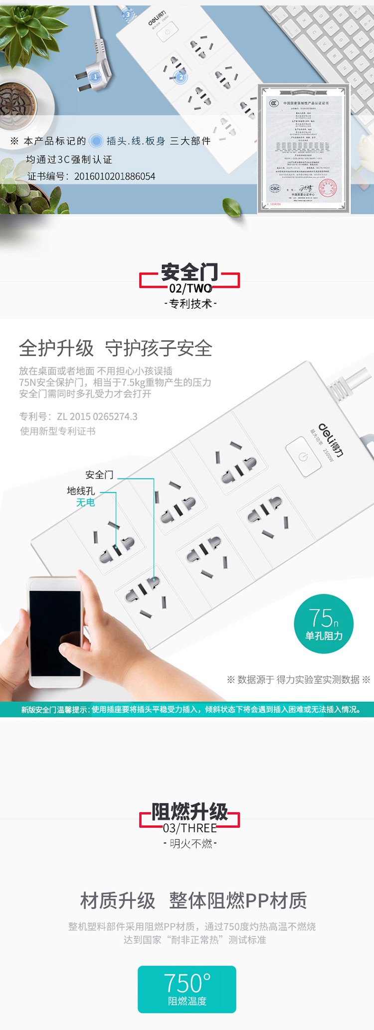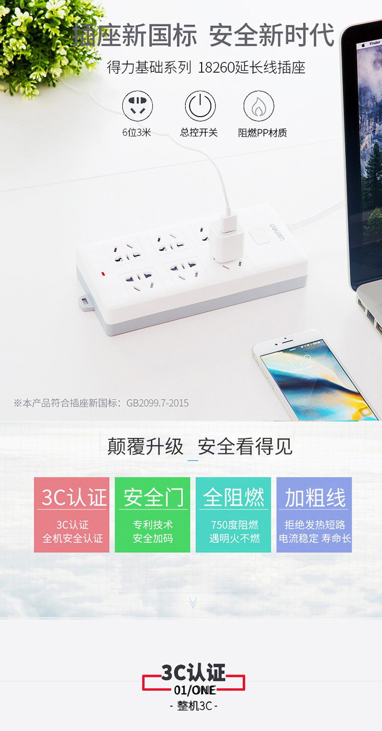 商品名称:得力(deli)18260 新国标6位组合孔3米 大孔距总控开关插座
