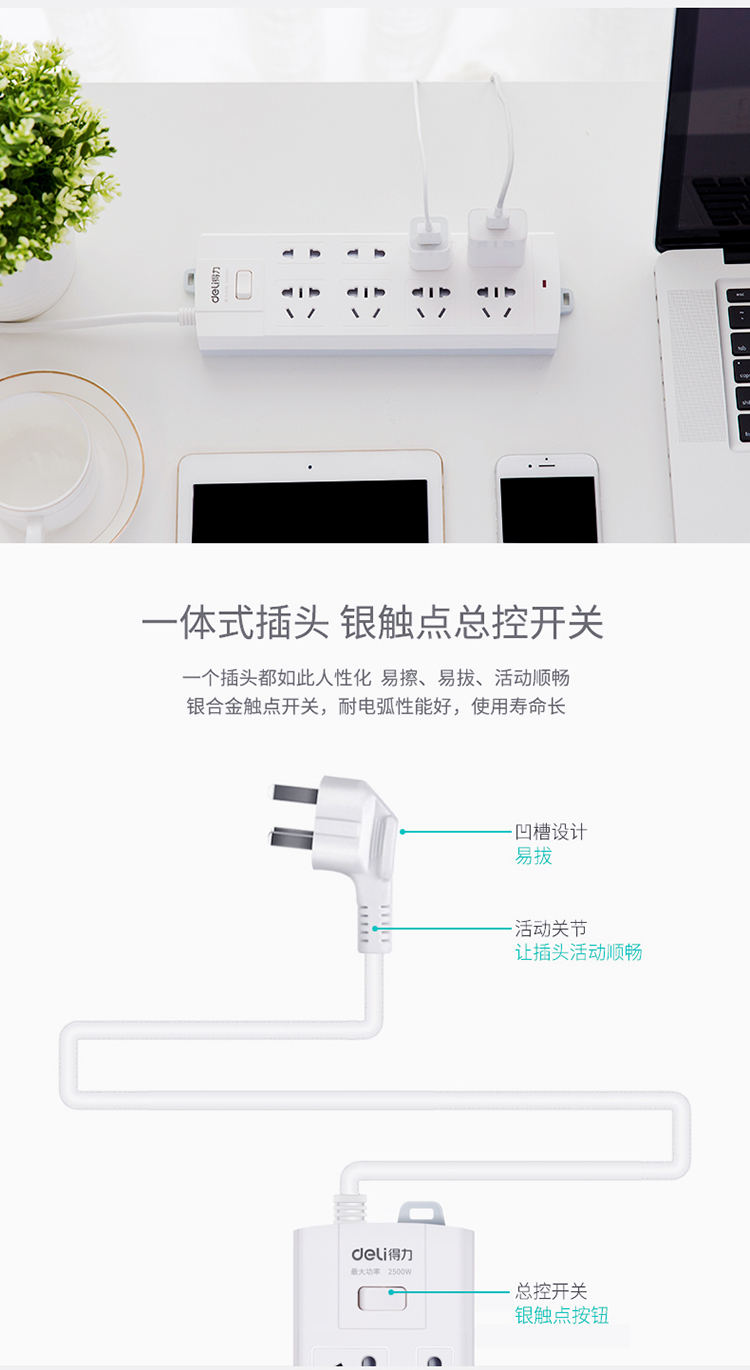 得力(deli)3983 新国标防过载8位5米 大孔距总控开关插座