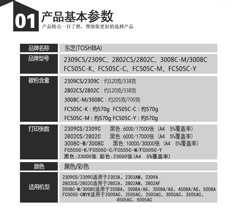 商品名称:东芝(TOSHIBA)FC505C-K黑色高容墨粉 适用2500AC/2000AC 3505 3005