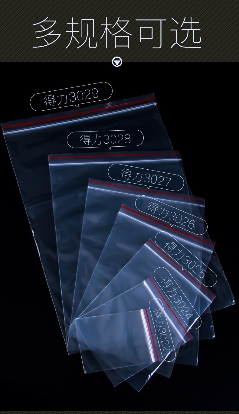 商品名称:得力 3024塑封袋/自封袋/包装袋/夹链袋/加厚密封 100个/包 透明 (5号/140*100mm)