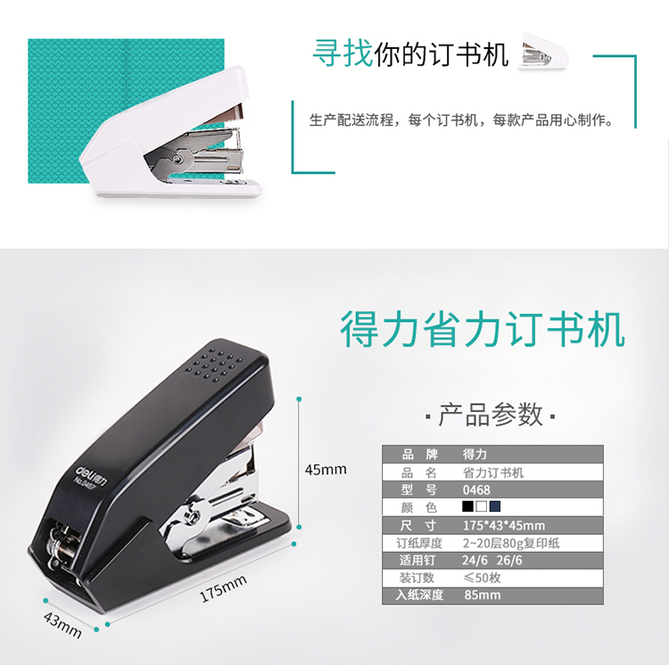 - 商品名称:得力(deli) 0468 省力订书机(可搭配24/6订书钉)大号 黑色