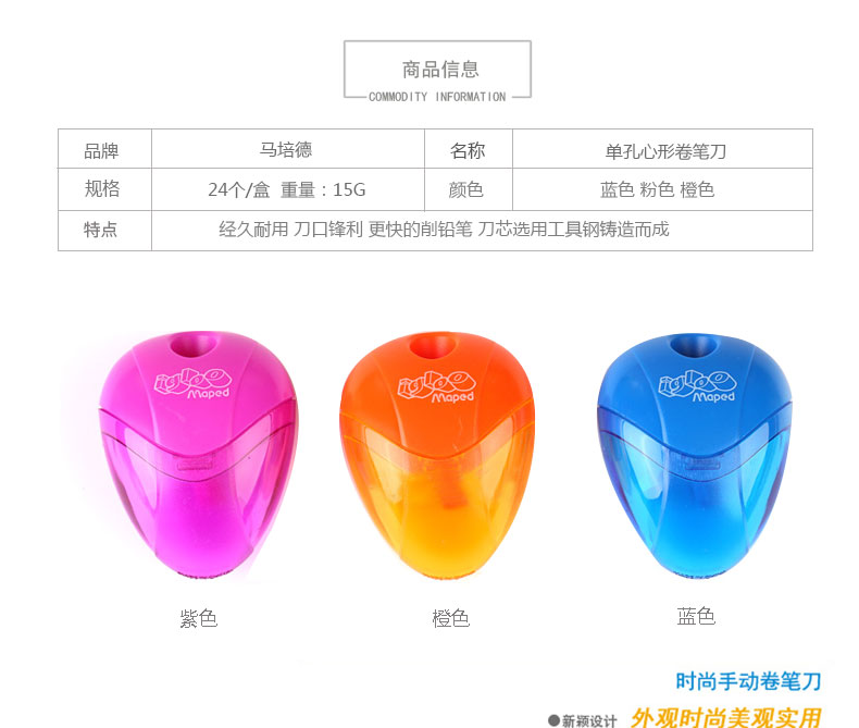 商品名称:马培德 534754 单孔心形转笔刀学生 色随机 30个/盒