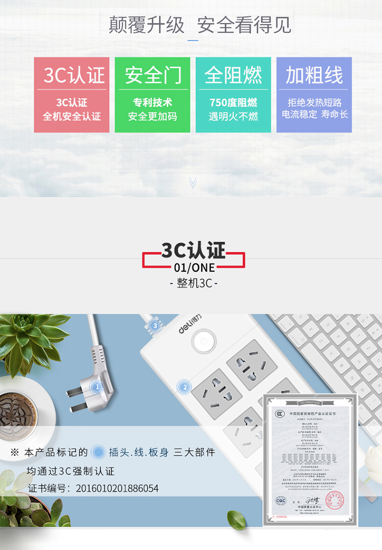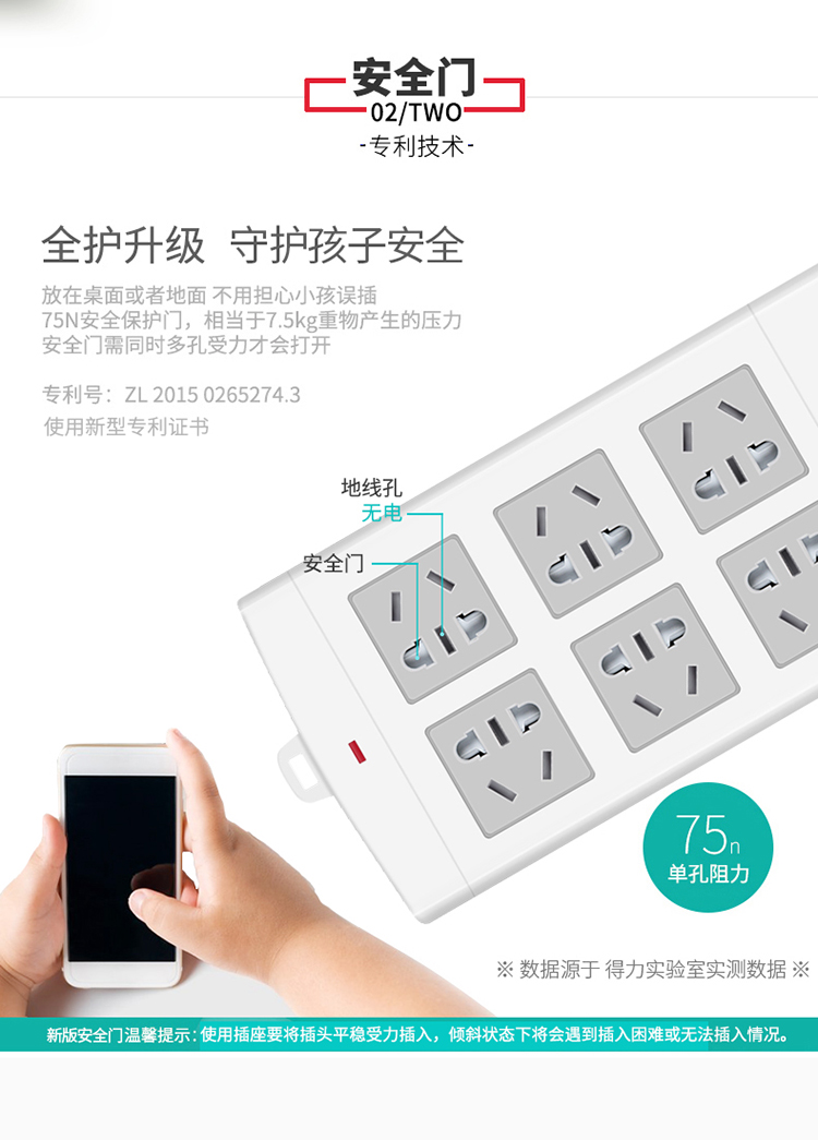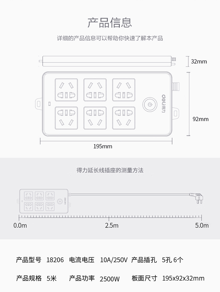 商品名称:得力(deli)18206 新国标6位组合孔5米 大孔距总控开关插座