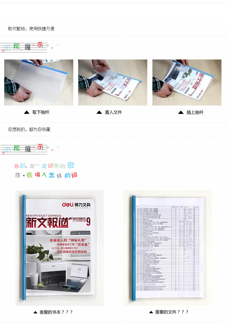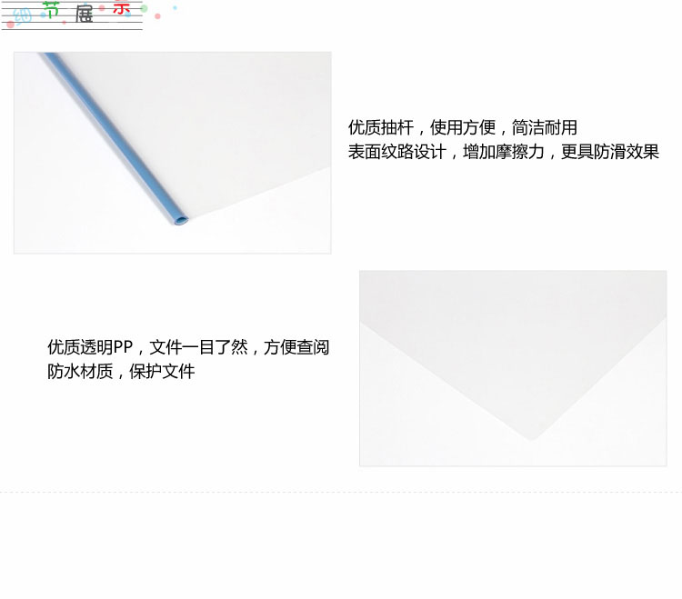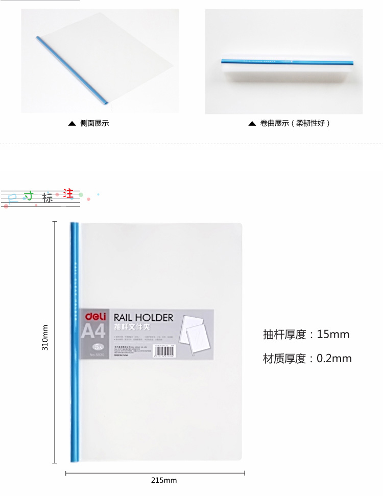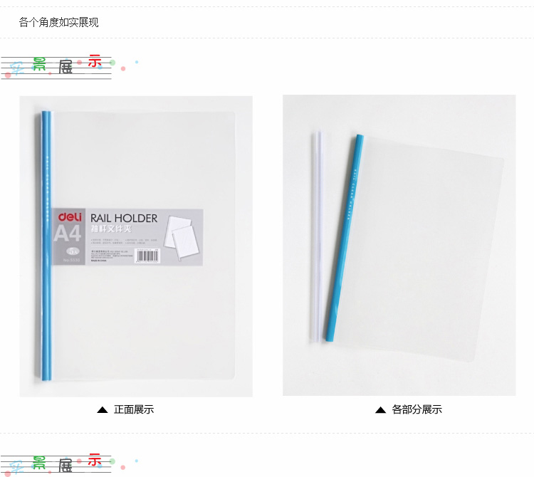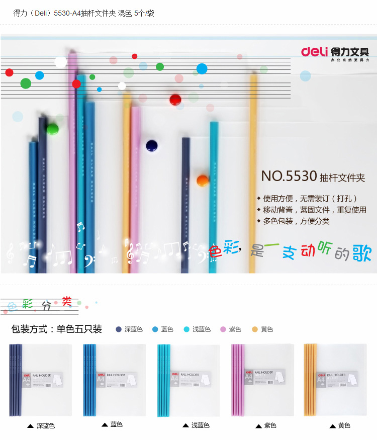 商品名称:得力(deli) 5530 A4透明抽杆夹 颜色随机 5个/包
