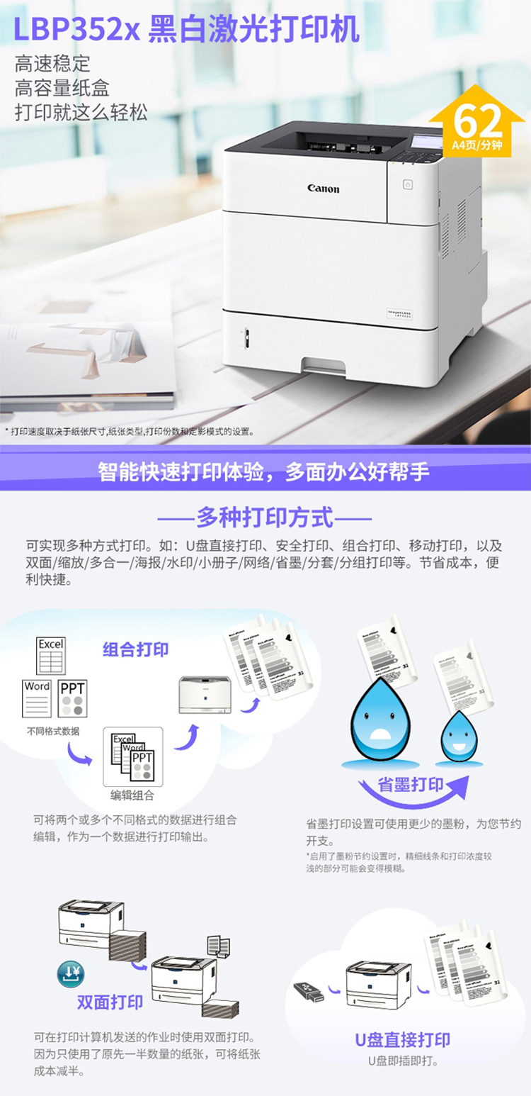 - 商品名称:佳能(Canon)imageCLASS LBP352x 黑白激光打印机 A4幅面 自动双面打印+U盘打印 支持有线网络打印 白色 一年保