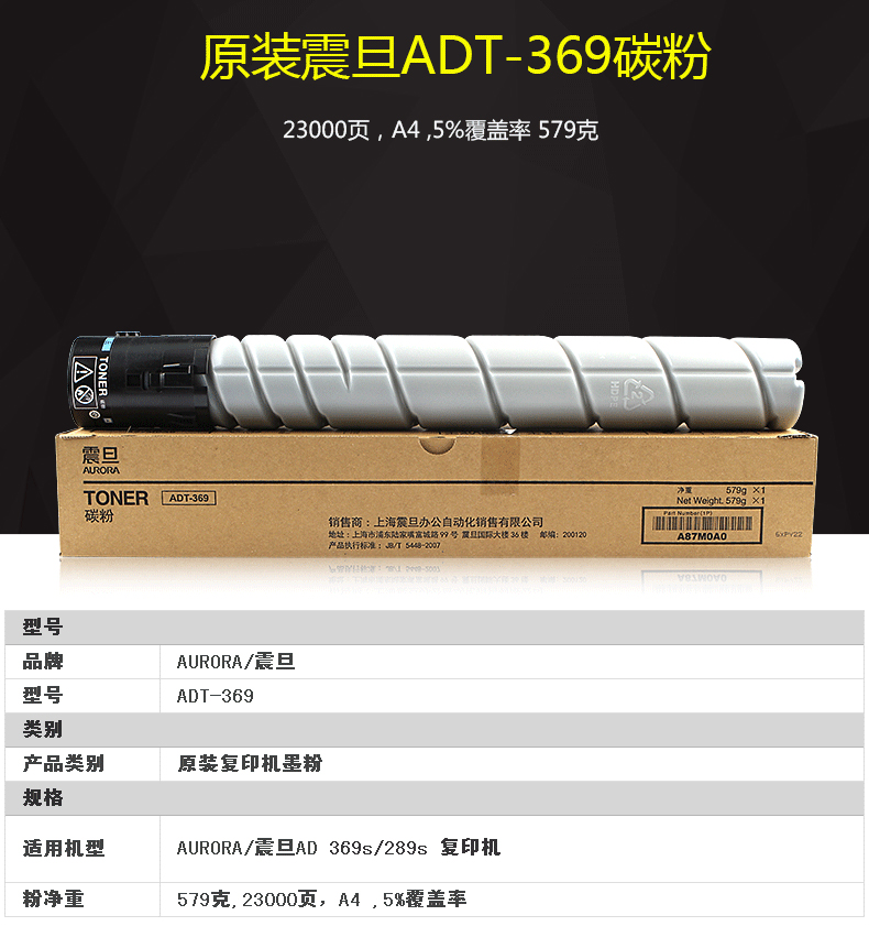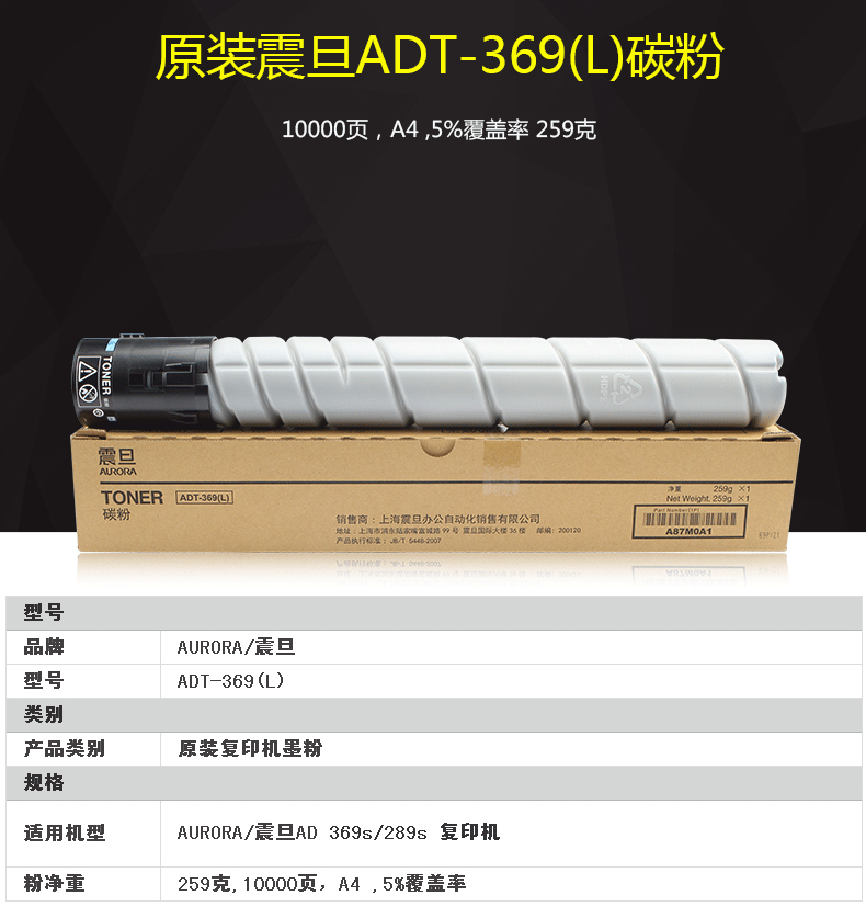 - 商品名称:震旦(AURORA)ADT369(L) 复印机粉盒 适用AD289s 369S