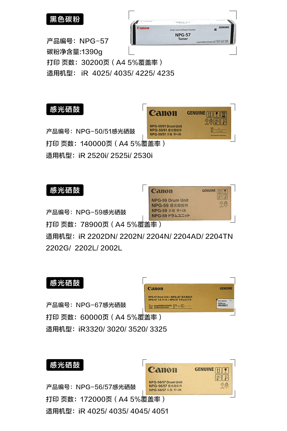 商品名称:佳能(Canon)数码复合机 NPG-57 原装黑色墨粉(适用于iR 4025/4035/4225/4235 )