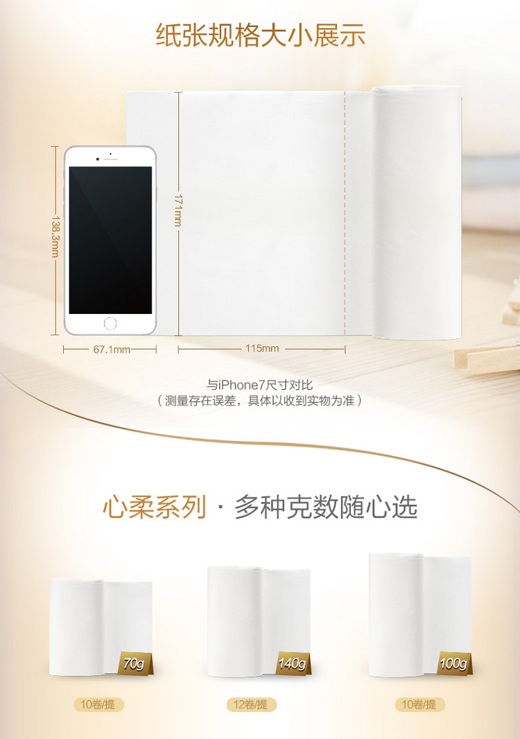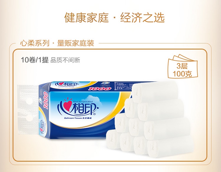 商品名称:心相印(Mind Act Upon Mind)无芯卷纸 心柔系列 卷纸3层100g*10卷/提