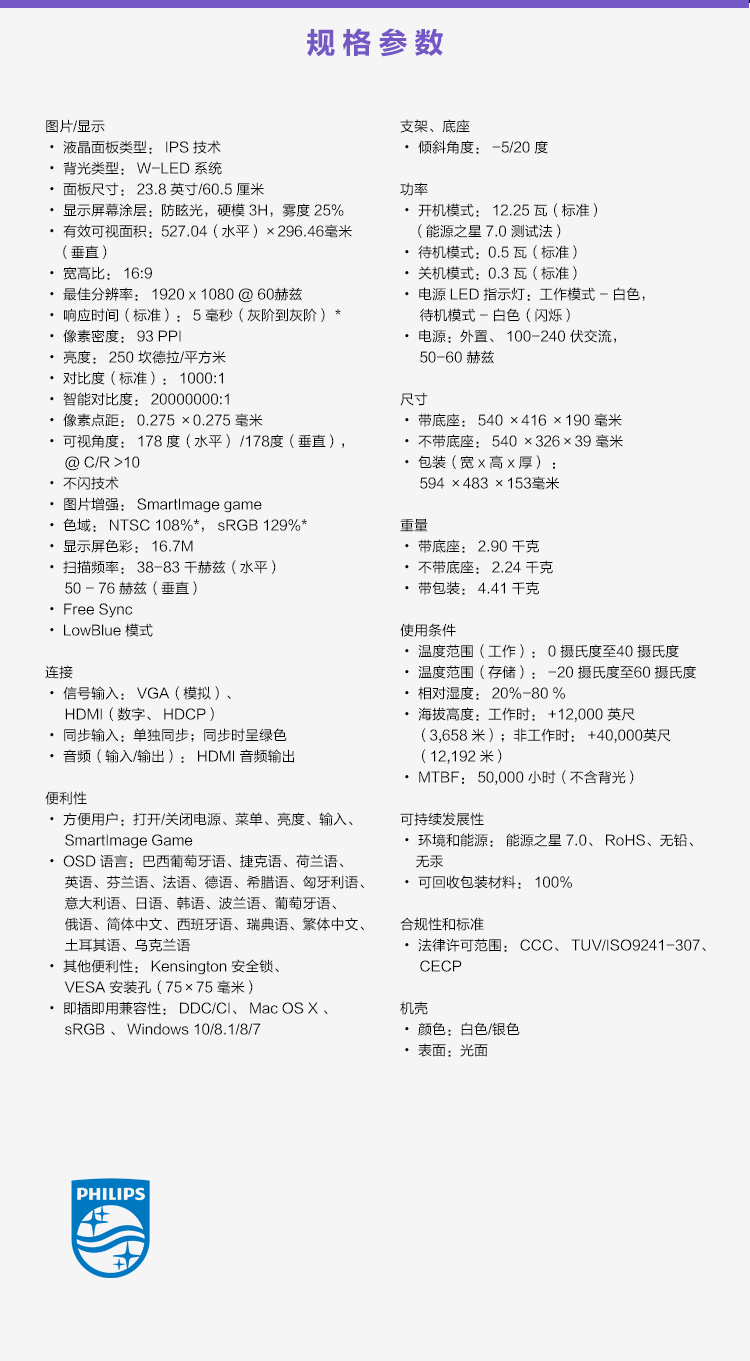 商品名称:飞利浦(PHILIPS) 246E9QHSW 显示器