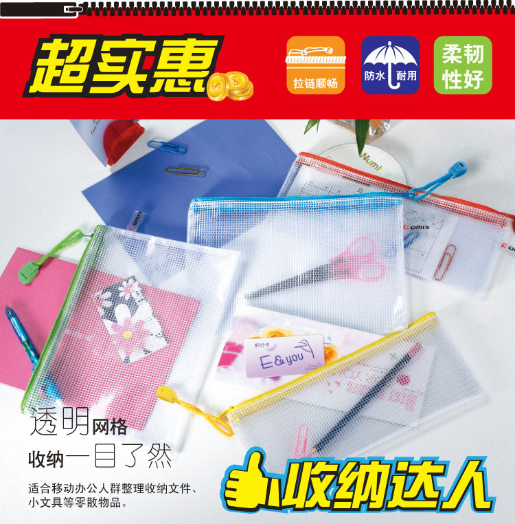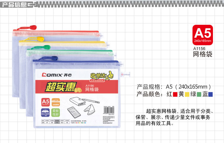 商品名称:齐心A1156经济型网格拉链袋A5无毒
