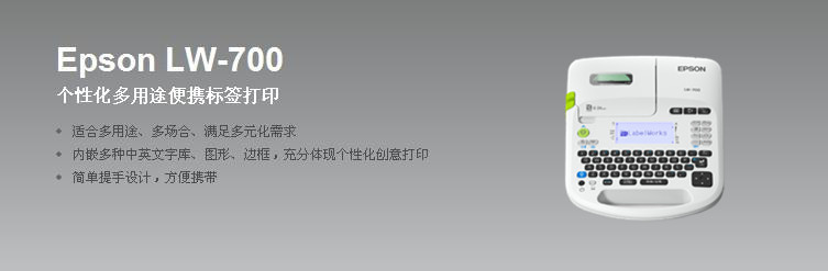 无论在办公室、公共设施应用还是个人应用,EPSON LW-700便携标签打印机凭借急需急用,方便快捷的标签打印特点,配以多种类,多颜色的个性化色带,轻松实现资产管理、设备识别、物品分类和警示标识等多种标签应用输出,快速提高工作效率。
