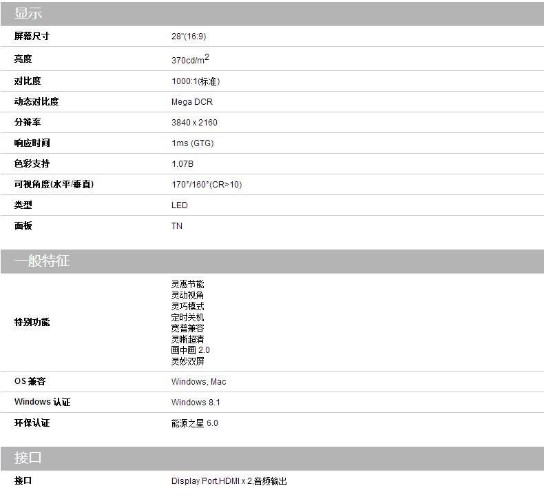 三星U28D590D 28英寸4K超清分辨率1MS时间响应 LED液晶显示器