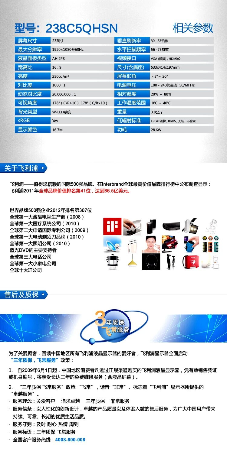 商品名称:飞利浦 238C4QHSN 23寸 AH-IPS硬屏 LED液晶显示器
