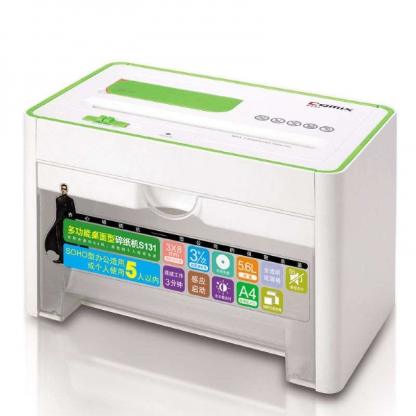 | 感应马达、精致机芯、超强静音、可碎CD、卡等 工作电流:0.6A 入纸口宽度:230mm 碎纸效果:3*8mm 碎纸能力:3张(A4,80G) 碎纸速度:1.6m/min 连续碎纸时间:3min 噪音:55db 纸屑桶容量:5.6L |