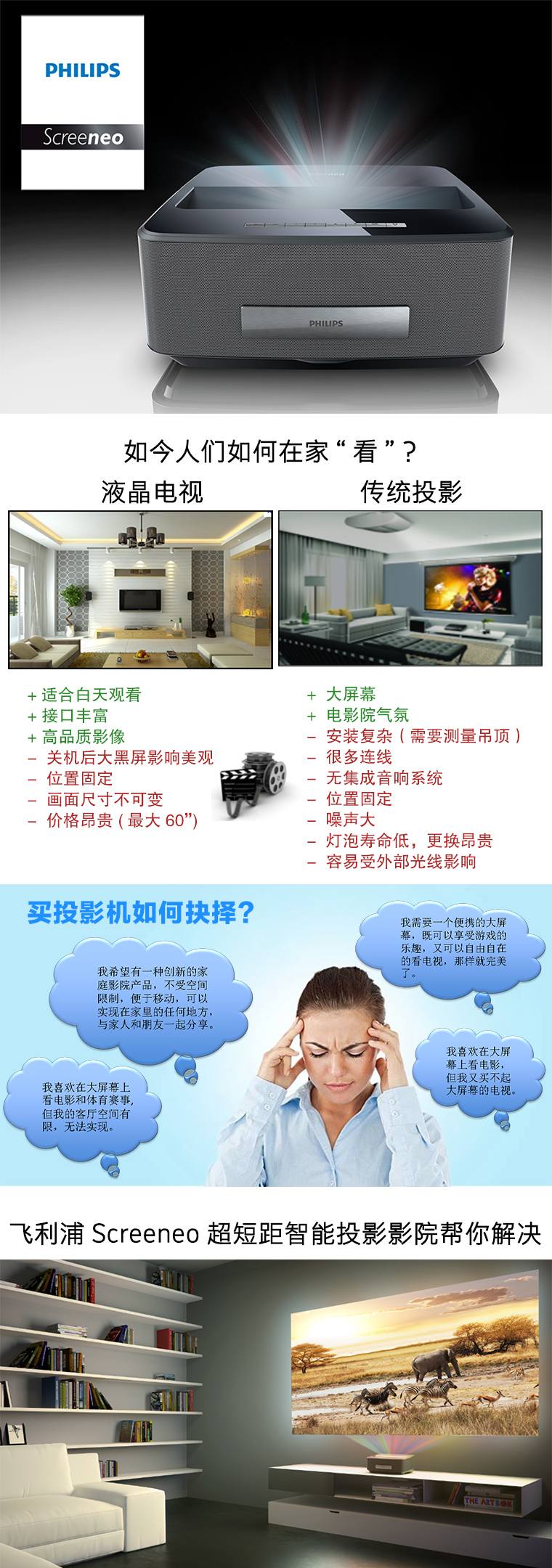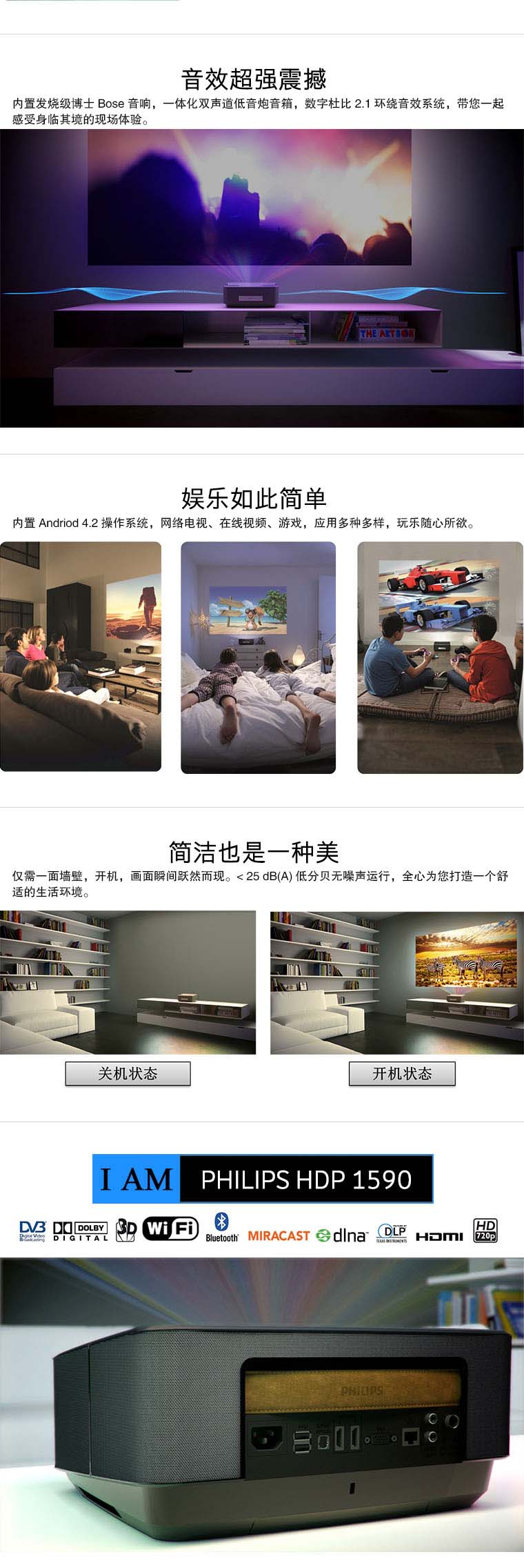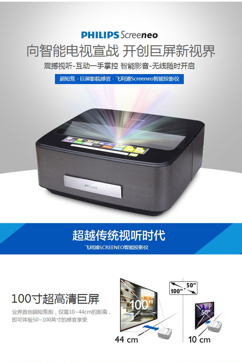 飞利浦LED超短焦投影仪HDP1590高清家用3D1080P智能影院无屏电视