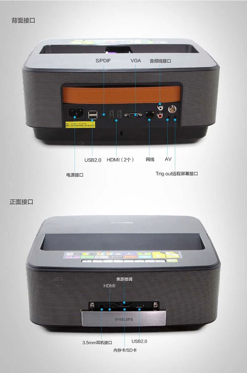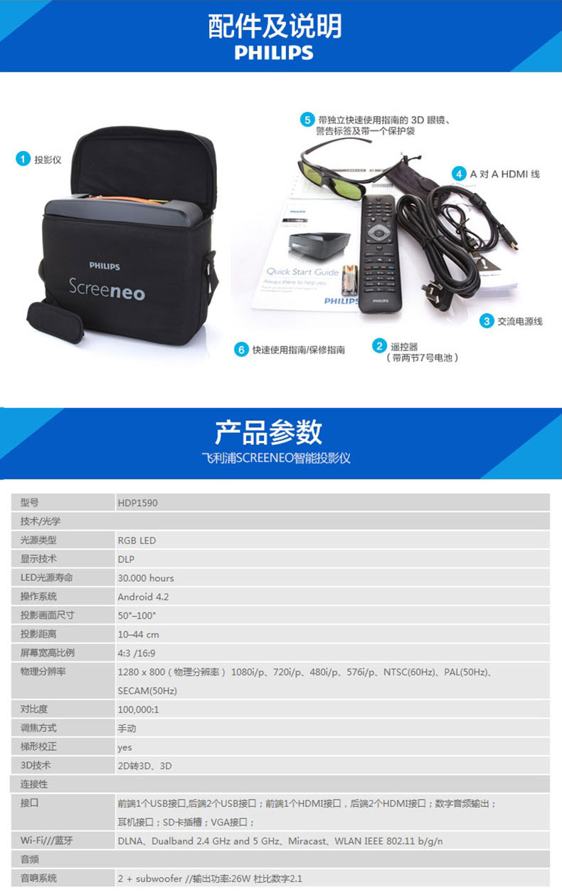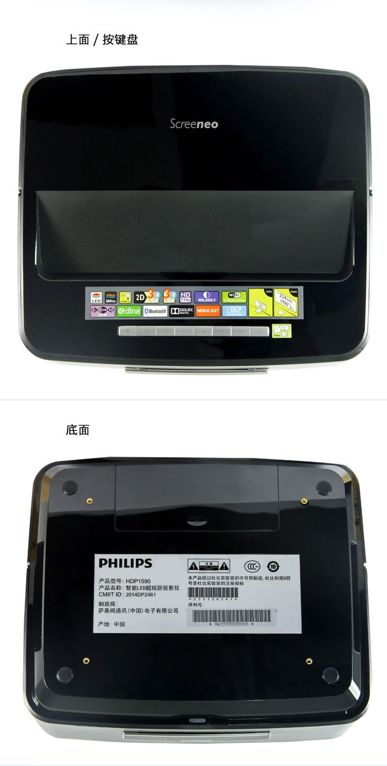 商品名称:飞利浦LED超短焦投影仪HDP1590高清家用3D1080P智能影院无屏电视
