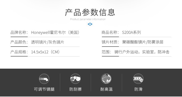 商品名称:霍尼韦尔(Honeywell)100110护目镜 S200A系列 黑色透明镜片 男女防风 防沙 防尘 防雾 骑行眼镜 10副/盒
