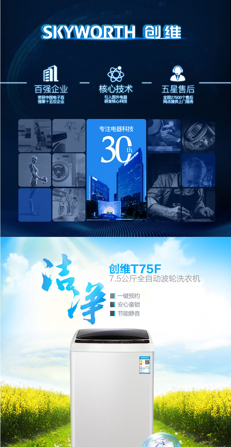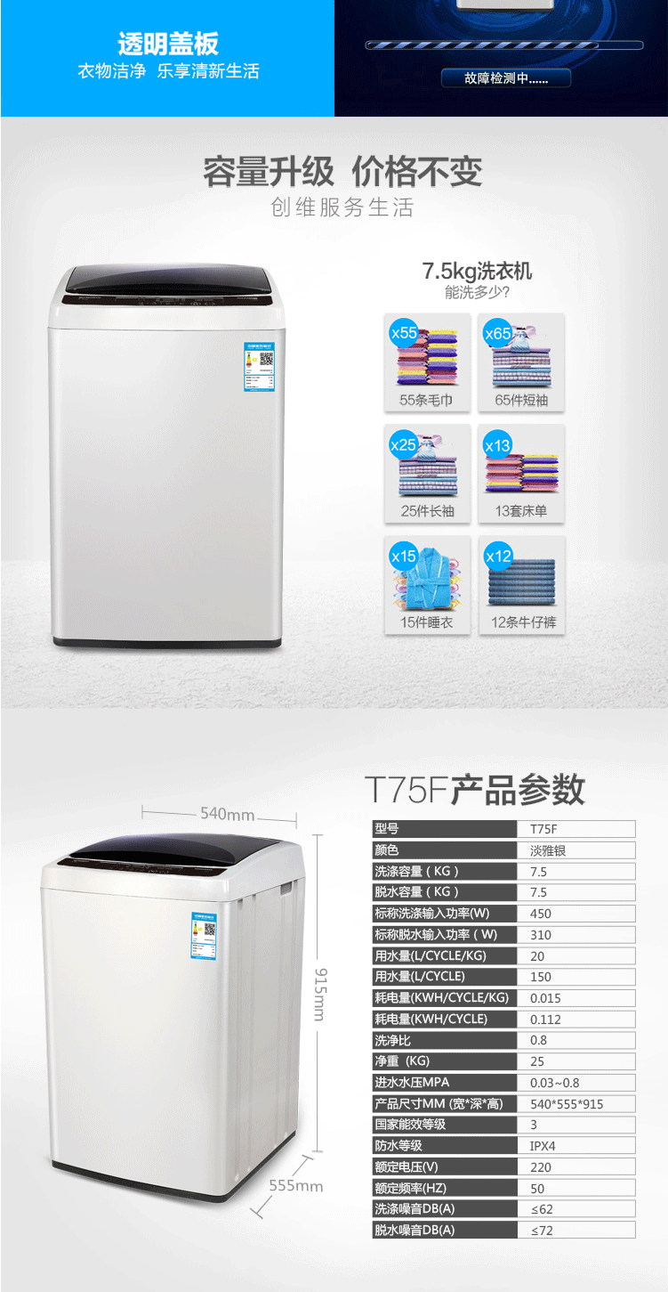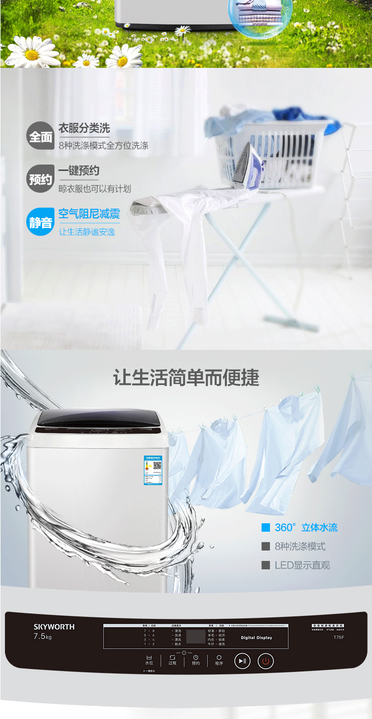 商品名称:创维(Skyworth)T75F 全自动波轮洗衣机 8种洗涤模式 7.5公斤(银色)