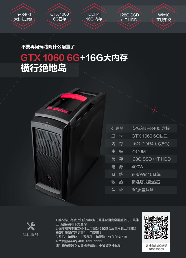 雷神(ThundeRobot)F81Pro台式电脑整机(i5-8400 16G GTX1060 6G 1T+128G)144Hz 27英寸