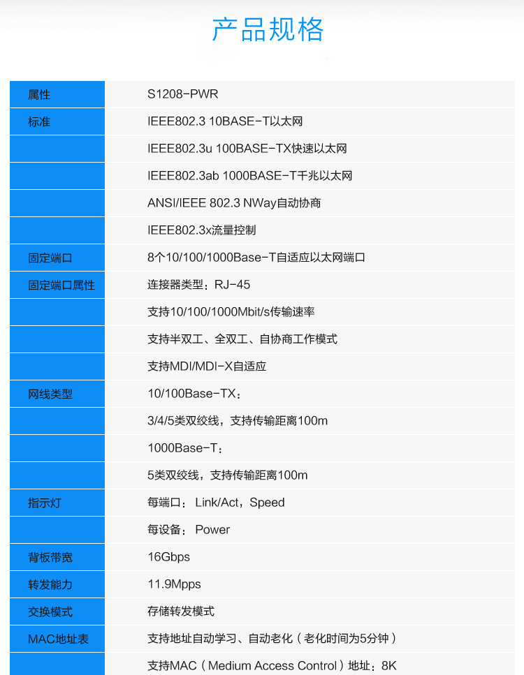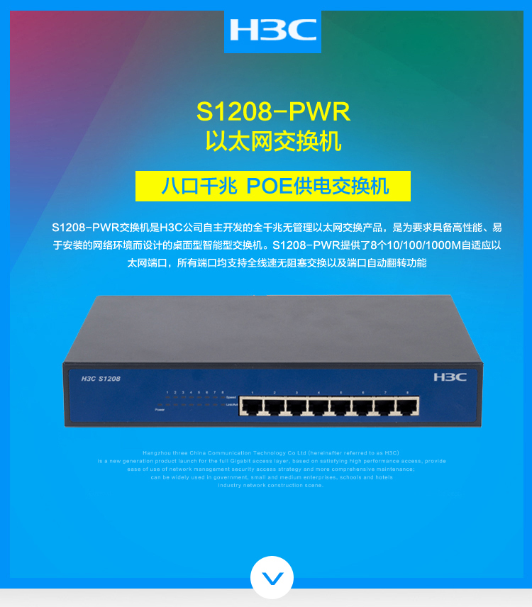 - 商品名称:华三 H3C S1208-PWR 8口千兆二层非网管POE 供电以太网交换机