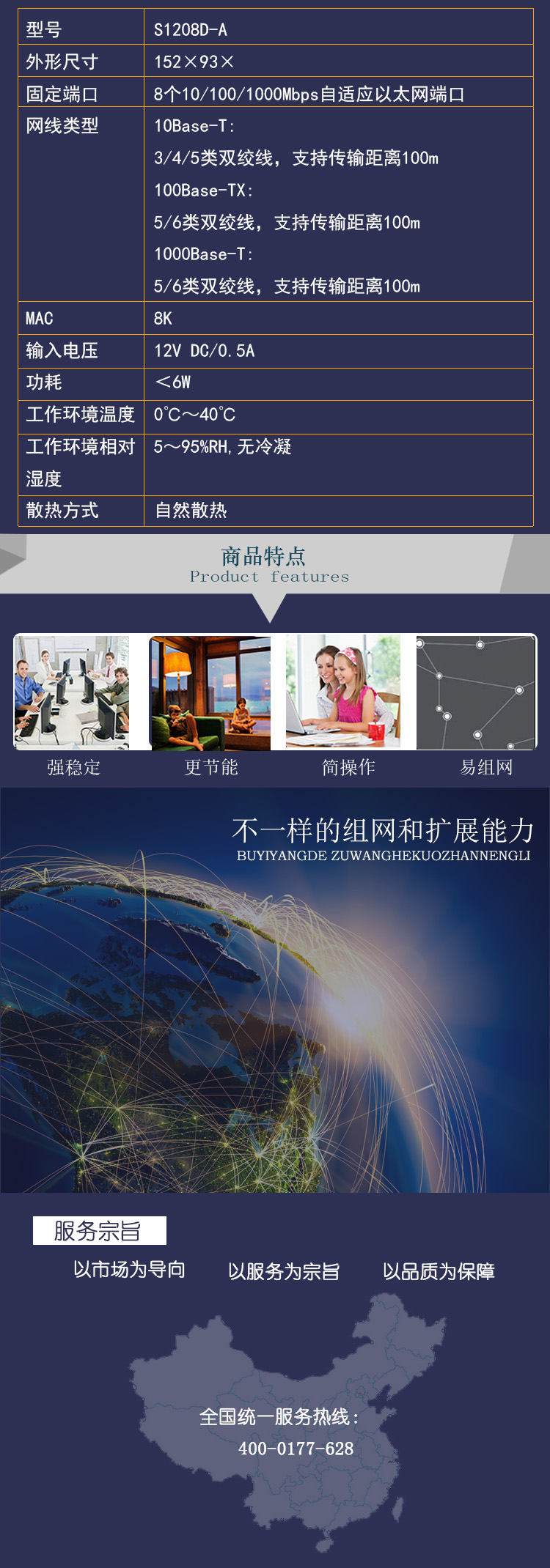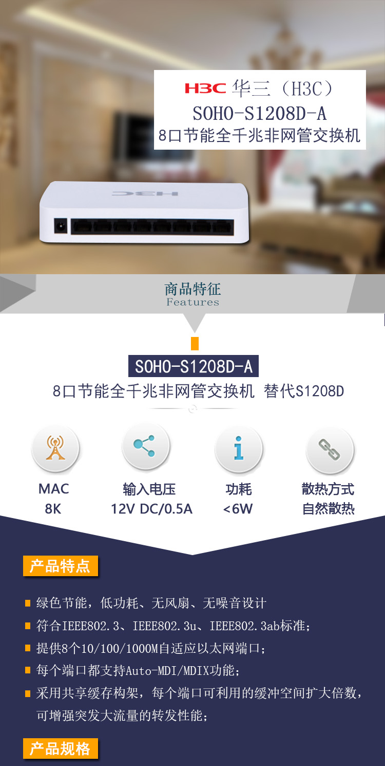 - 商品名称:华三 H3C S1208D-A8 口全千兆以太网交换机