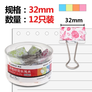 商品名称:齐心 (COMIX) B3685 32mm彩色印花长尾夹/票据夹/燕尾夹/铁夹子 12只装