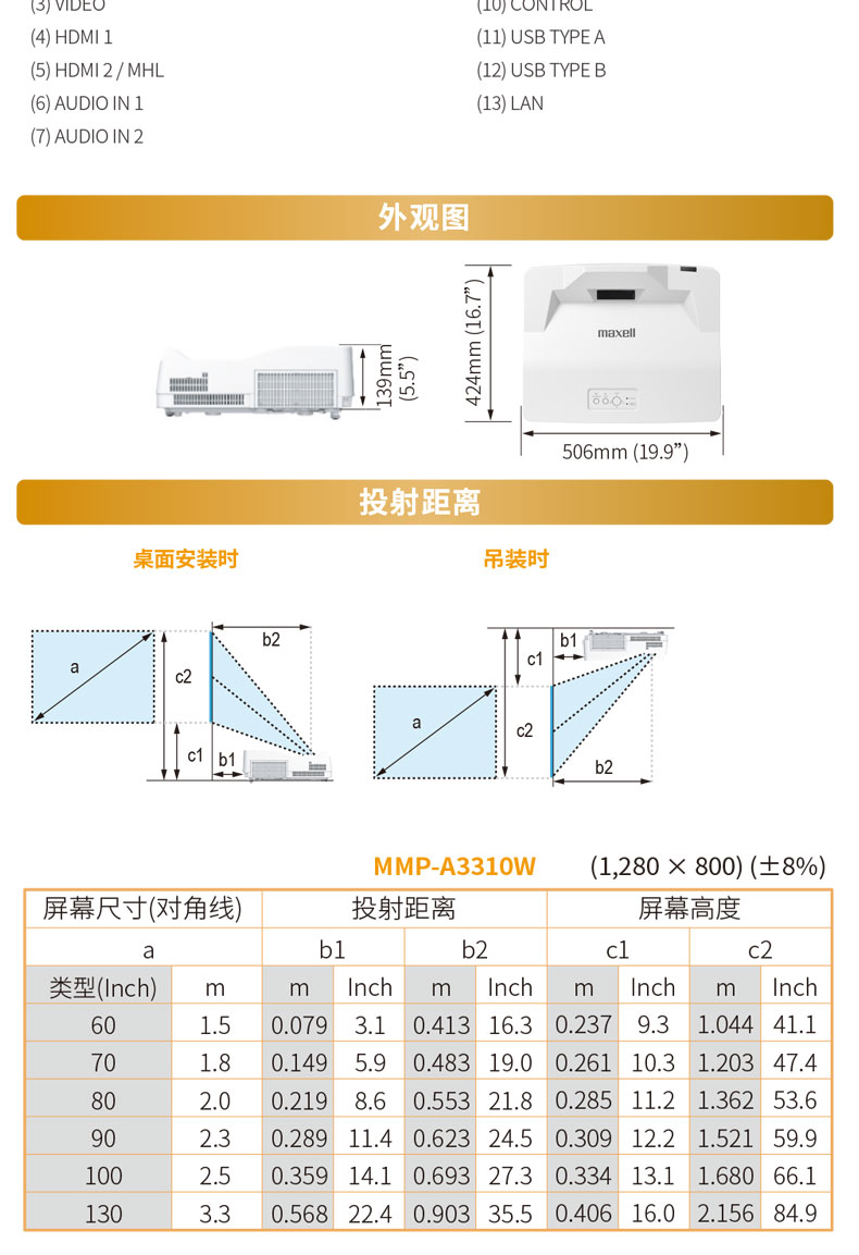 麦克赛尔(Maxell)MMP-A3310W 反射短焦激光投影机(3300流明/WXGA)