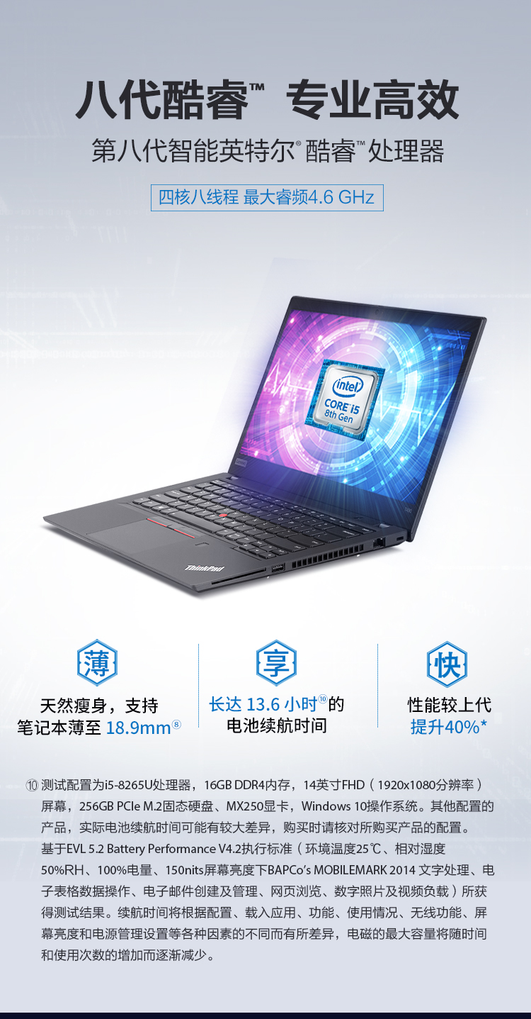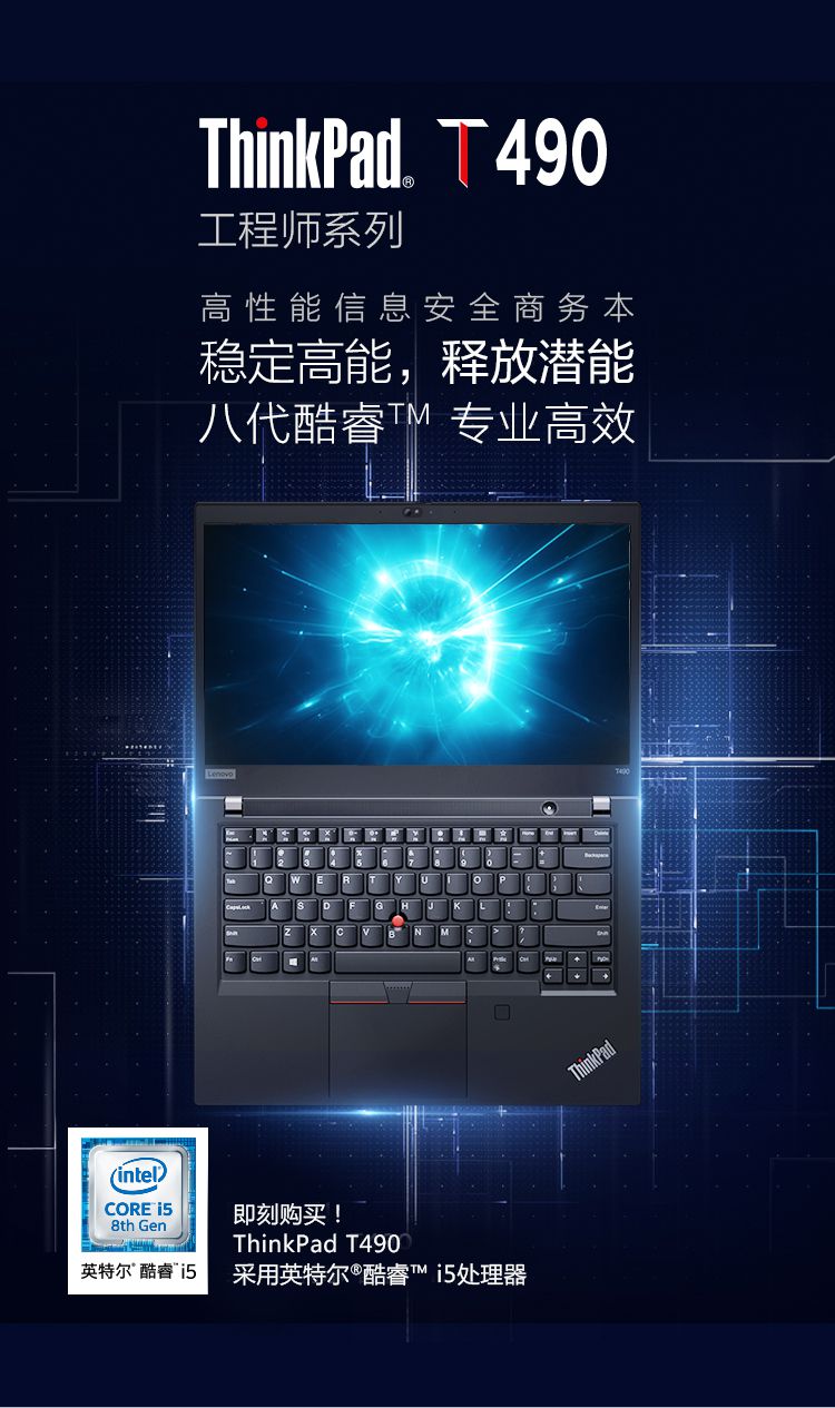 商品名称:联想ThinkPad T490(20N2A008CD)英特尔酷睿i5 14英寸轻薄笔记本电脑(i5-8265U 8G 512GSSD FHD 指纹识别)