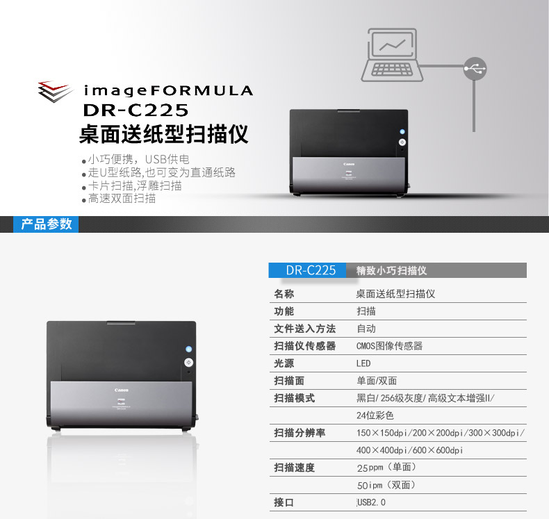 商品名称:佳能(Canon)DR-C225 A4幅面 高速扫描仪(馈纸式)