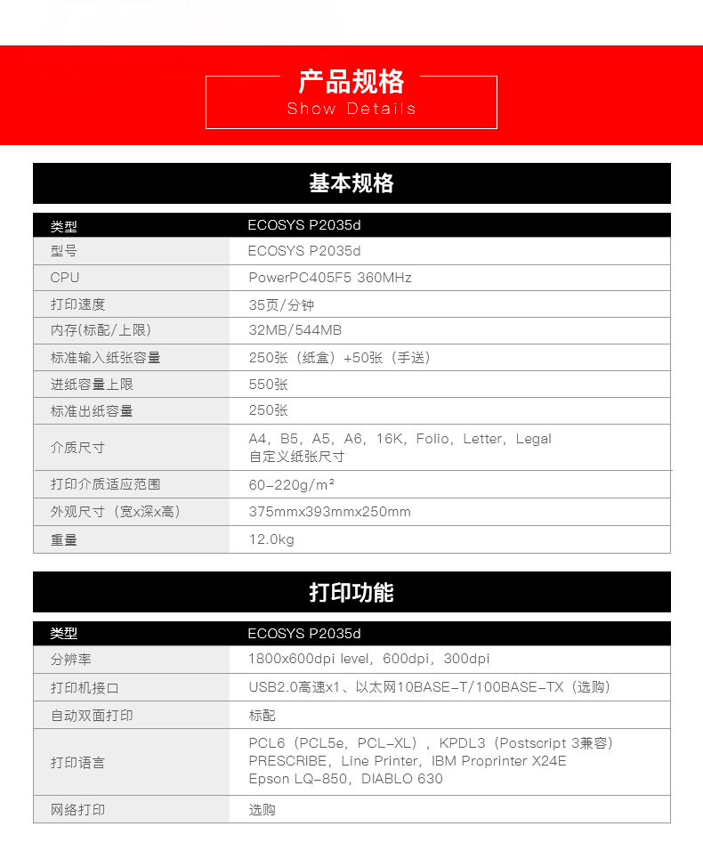 商品名称:京瓷(Kyocera)ECOSYS P2035d A4 黑白激光打印机