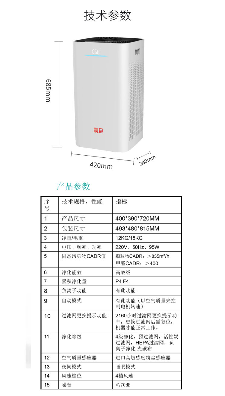 商品名称:震旦 AA-835 空气净化器 除甲醛/除雾霾/除菌/除花粉 颗粒物CADR(≥835m /h)