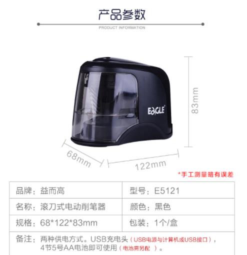 - 商品名称:益而高 E5121 滚刀式电动削笔器电动卷笔刀 USB接口供电/电池供电 黑色