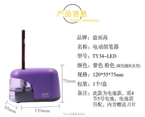 商品名称:益而高 TY34-LED 炫光电动削笔器 电池款 电动铅笔学习文具多功能小学生卷笔刀 颜色随机