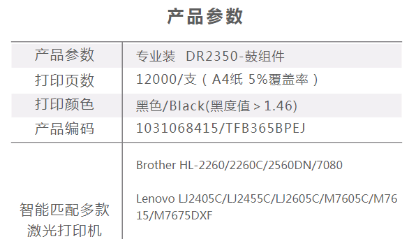 商品名称:天威 BROTHER-DR2350-鼓组件 专业装 适用于兄弟HL-2260/2260C/2560DN 联想LJ2405C/LJ2455C/LJ2605C