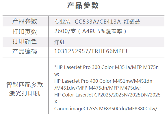 商品名称:天威 CE413 通用硒鼓 红色 专业装 适用HP CC533A CE413A 2025 2025DN 2025N 351a 451dn 451nw