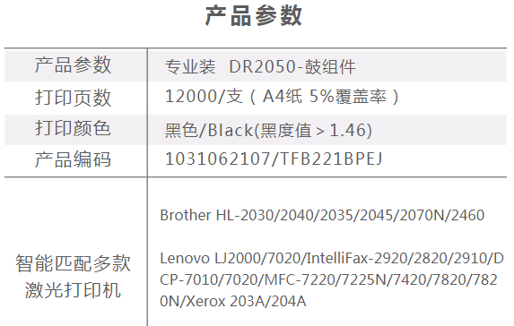 商品名称:天威 LENOVO-LJ2000/BROTHER-DR2050-鼓组件-新版 专业装 适用于兄弟HL-2030/2040/2035 联想LJ2000/7020 2920/2820/2910