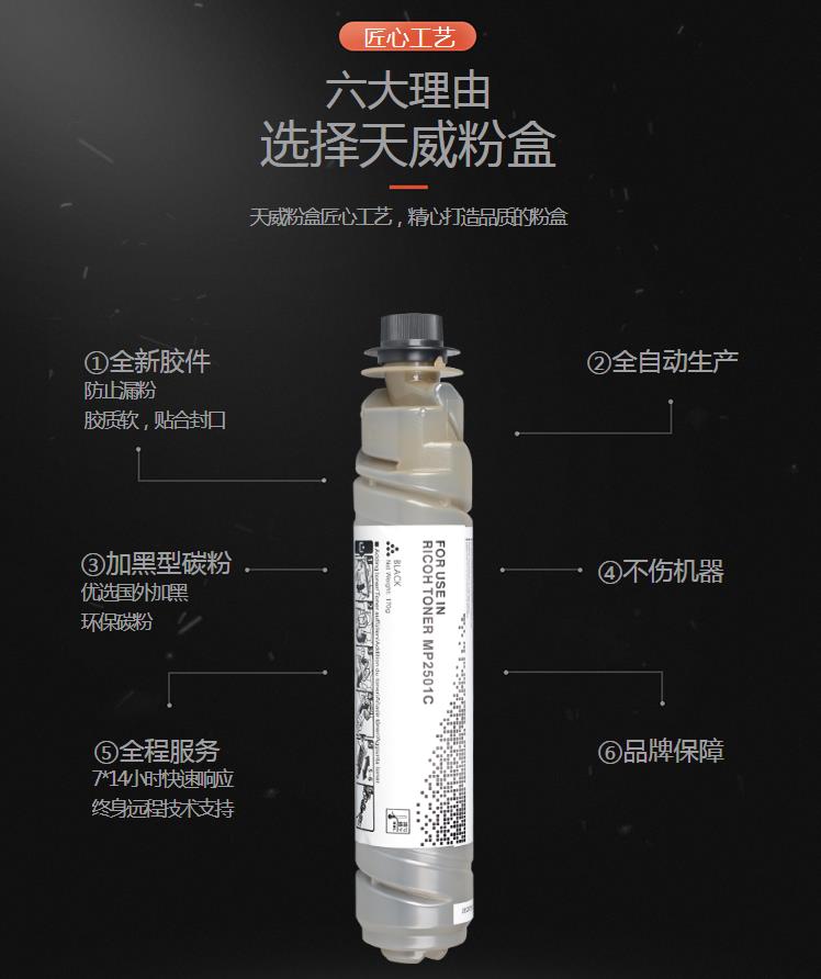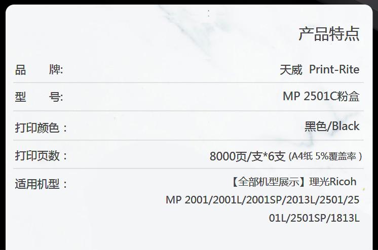 商品名称:天威 RICOH-MP2501C-230G-BK-复印机粉盒 适用于MP1813/2001/2013/2501/1813L/2001L