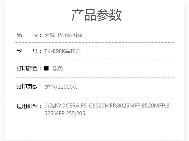 商品名称:天威 KYOCERA-TK898-240G-黑色复粉粉盒带芯片 经典装 适用于京瓷FS-C8020MFP/8025MFP/C8520MFP/C8525MFP
